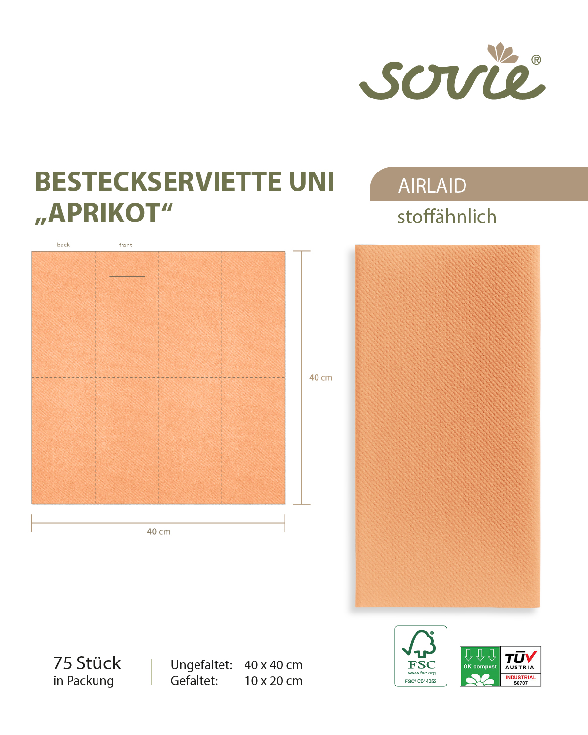 Erhältlich im praktischen 75er-Pack, sind diese Besteckservietten die ideale Wahl für Restaurants, Caterings oder festliche Feiern. Die edle APRIKOT-Farbe harmoniert wunderbar mit natürlichen oder pastelligen Tischdekorationen und sorgt für eine warme, einladende Atmosphäre. Setze auf Qualität und Stil mit diesen Premium-Airlaid-Servietten!