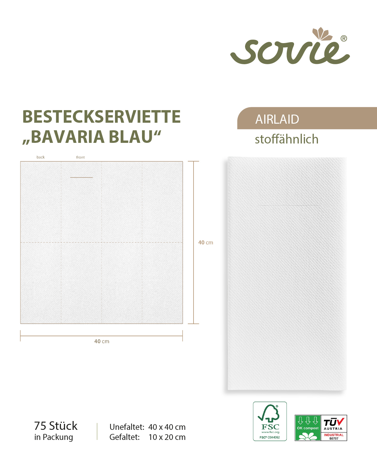 Die Airlaid Besteckserviette BAVARIA in Blau-Weiß bringt die traditionelle bayerische Eleganz und eine praktische Handhabung auf Ihren Tisch. Mit einer großzügigen Größe von 40 x 40 cm und einer Verpackungseinheit von 4 x 75 Stück bieten diese Servietten sowohl eine attraktive Optik als auch hervorragende funktionale Eigenschaften. Das hochwertige Airlaid-Material sorgt für eine stoffähnliche Haptik, die sich angenehm weich anfühlt und gleichzeitig robust und saugfähig ist.