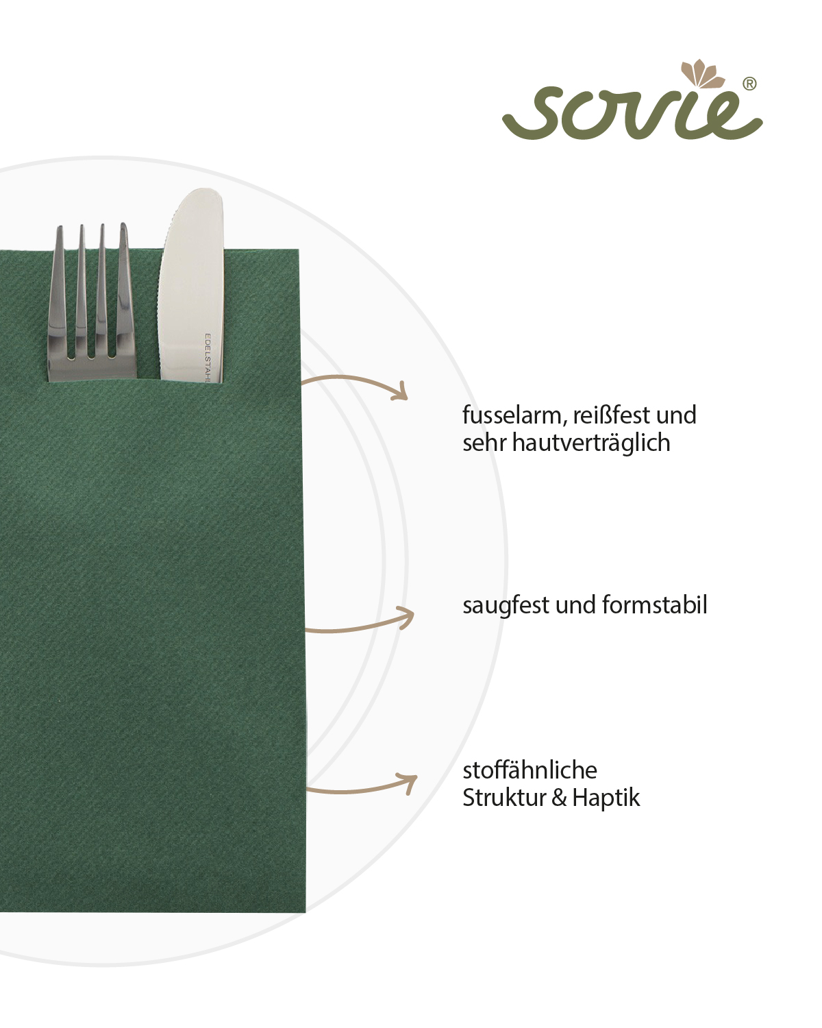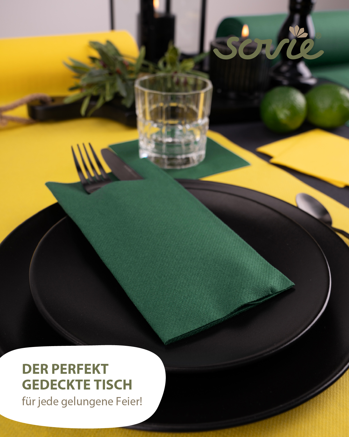 Verleihe deinem Tischarrangement mit der Besteckserviette in DUNKELGRÜN aus Linclass® Airlaid eine edle und elegante Ausstrahlung. Der tiefgrüne Farbton sorgt für eine luxuriöse und beruhigende Atmosphäre und ist perfekt für gehobene Gastronomie, festliche Anlässe oder besondere Events. Diese Serviette kombiniert die edle Optik von Stoff mit der praktischen Handhabung eines hochwertigen Einwegprodukts.