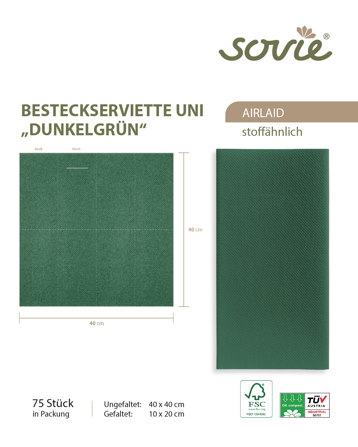 Im praktischen 75er-Pack erhältlich, sind diese Besteckservietten die perfekte Wahl für Restaurants, Caterings oder besondere Feiern. Die edle DUNKELGRÜN-Farbe lässt sich hervorragend mit goldenen, silbernen oder natürlichen Dekorationen kombinieren und sorgt für eine harmonische und elegante Tischgestaltung. Setze auf Qualität und Stil mit diesen Premium-Airlaid-Servietten!