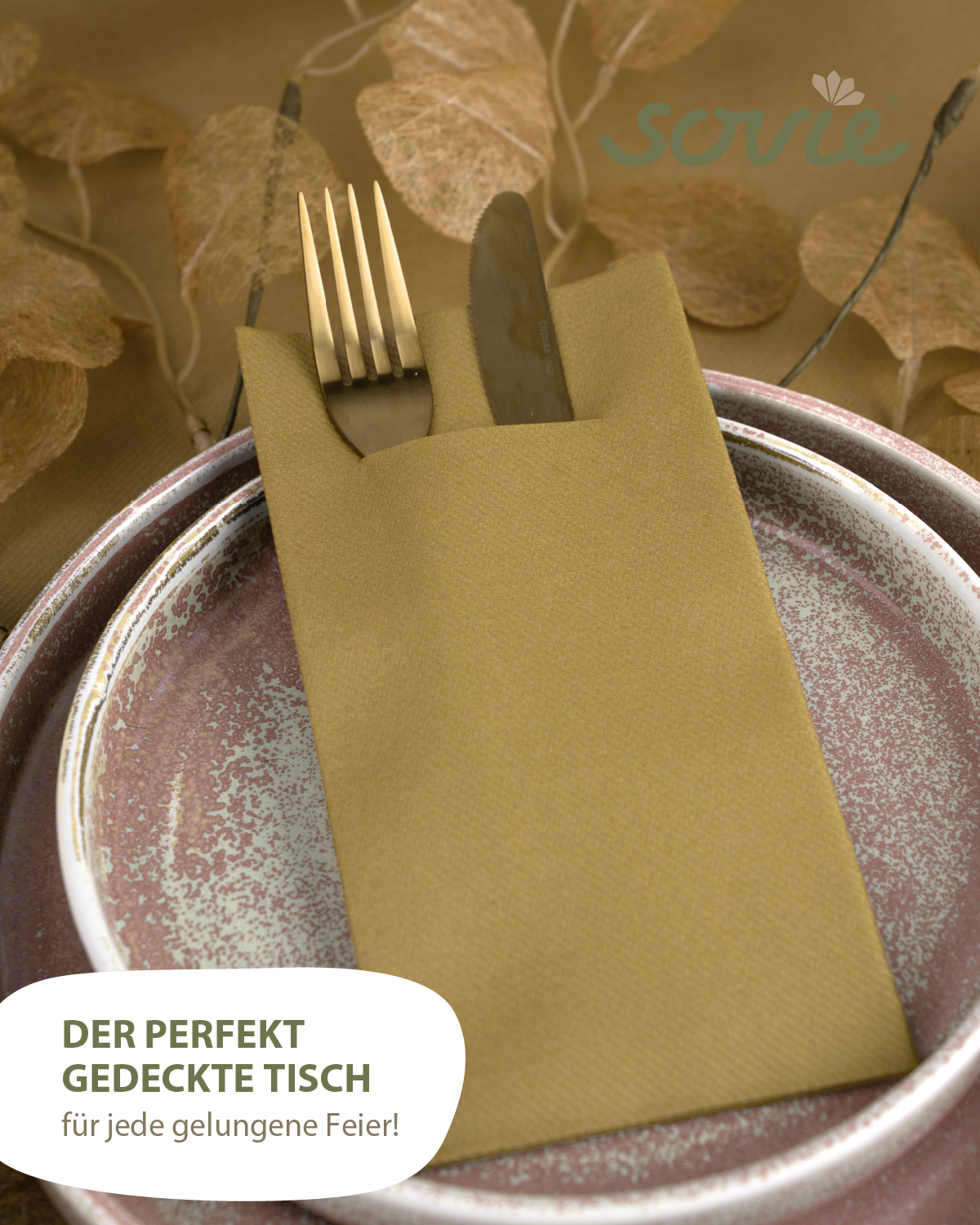 Im praktischen 75er-Pack erhältlich, bieten diese Besteckservietten eine besonders wirtschaftliche Lösung für Restaurants, Catering-Services oder private Feiern. Die strahlende GOLD-Farbe lässt sich hervorragend mit anderen festlichen Dekorationen kombinieren und sorgt für eine elegante und festliche Atmosphäre. Setze auf Qualität und Stil mit diesen Premium-Airlaid-Servietten!