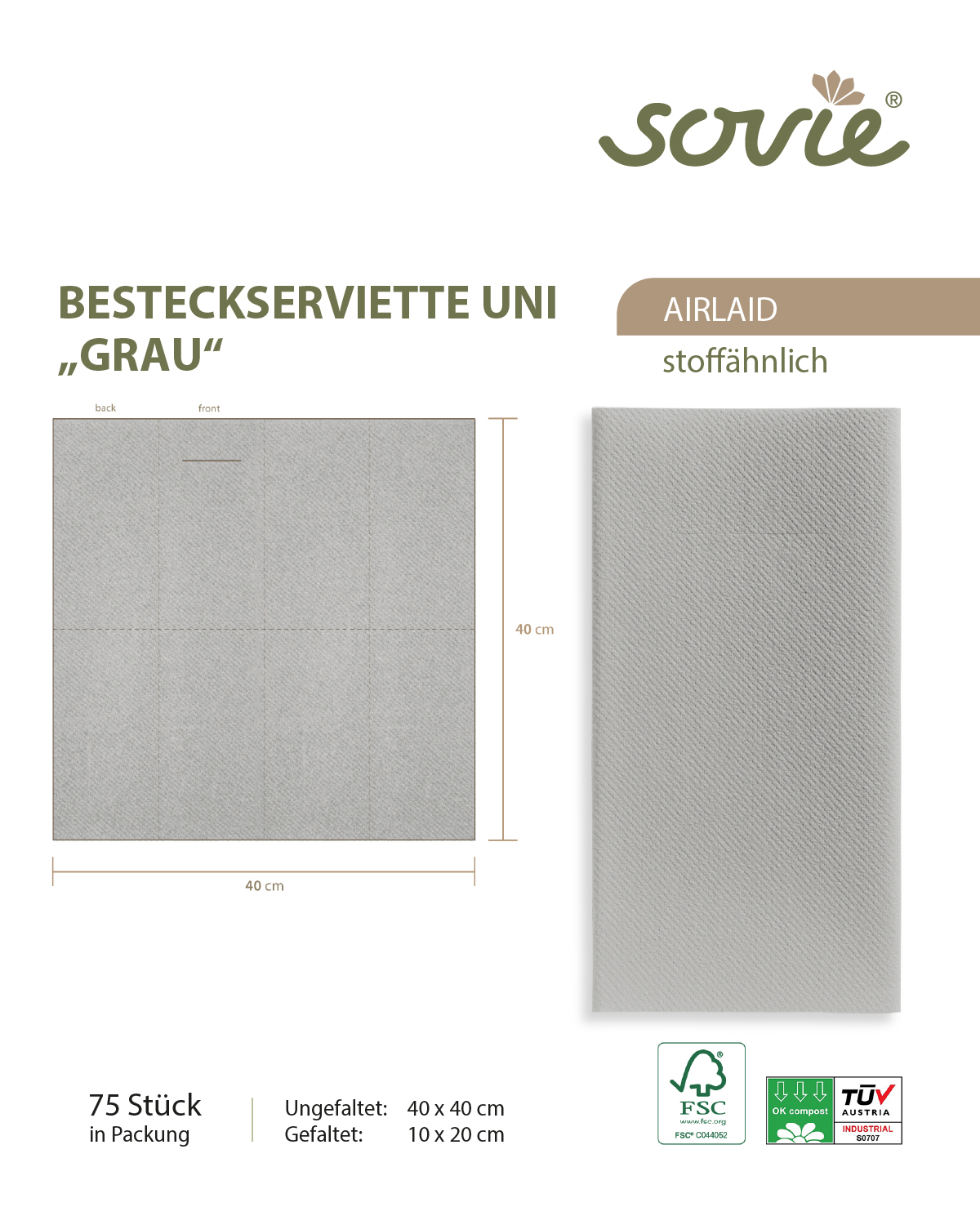 Im praktischen 75er-Pack erhältlich, bieten diese Besteckservietten eine besonders wirtschaftliche Lösung für Restaurants, Catering-Services oder private Feierlichkeiten. Die vielseitige GRAU-Farbe lässt sich hervorragend mit verschiedenen Dekorationsstilen kombinieren und sorgt für eine elegante und harmonische Atmosphäre. Setze auf Qualität und Stil mit diesen Premium-Airlaid-Servietten!