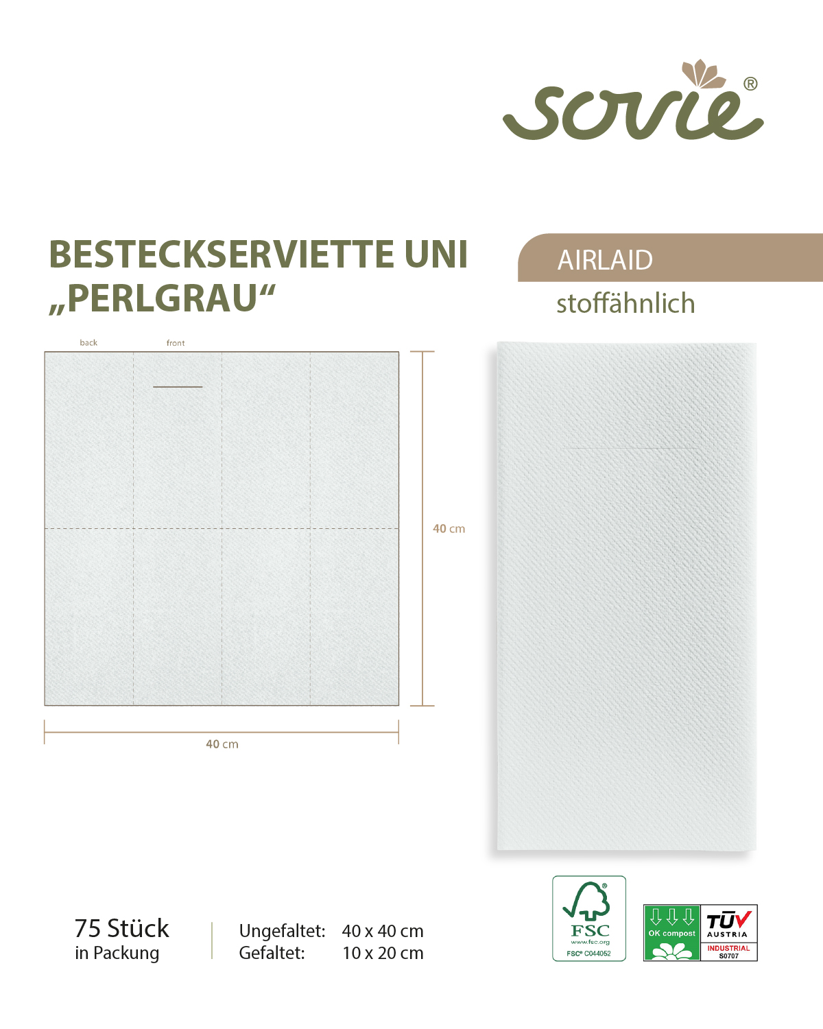Erhältlich im praktischen 75er-Pack, sind diese Besteckservietten eine wirtschaftliche Lösung für den professionellen Einsatz in Restaurants, Catering-Services oder besonderen Anlässen. Die elegante PERLgrau-Farbe lässt sich mühelos mit verschiedenen Dekorationsstilen kombinieren und sorgt für eine ruhige, harmonische Atmosphäre. Setze auf Qualität und Stil mit diesen Premium-Airlaid-Servietten!