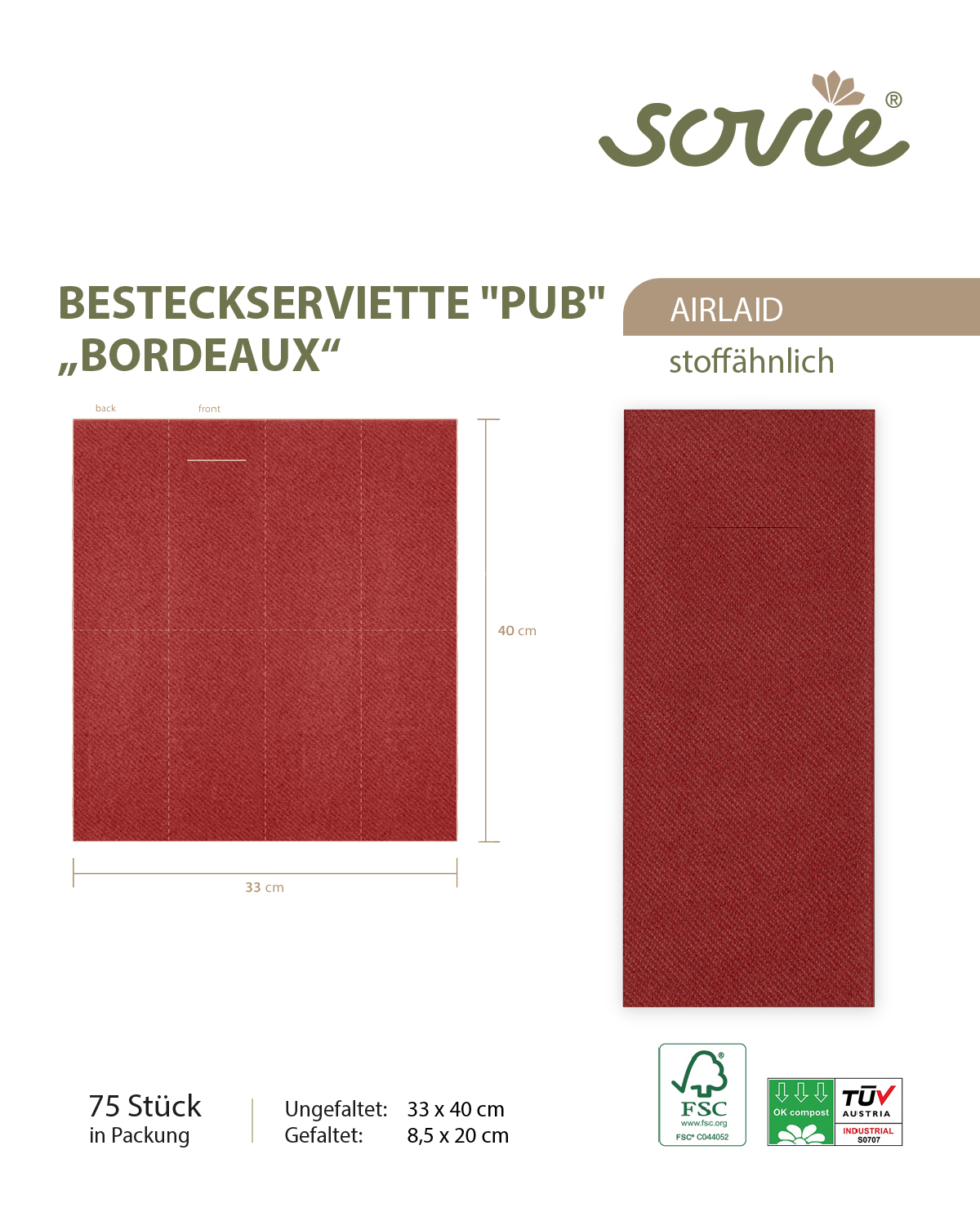 Die Besteckserviette "Pub" in BORDEAUX aus Linclass® Airlaid ist die perfekte Wahl, um Ihrem Tisch eine elegante und raffinierte Atmosphäre zu verleihen. Der tiefrote Farbton erinnert an luxuriöse Weine und fügt sich ideal in gehobene Veranstaltungen, festliche Anlässe oder die gehobene Gastronomie ein. Bordeaux bringt Wärme und Stil auf Ihren Tisch und sorgt für einen bleibenden Eindruck bei Ihren Gästen.