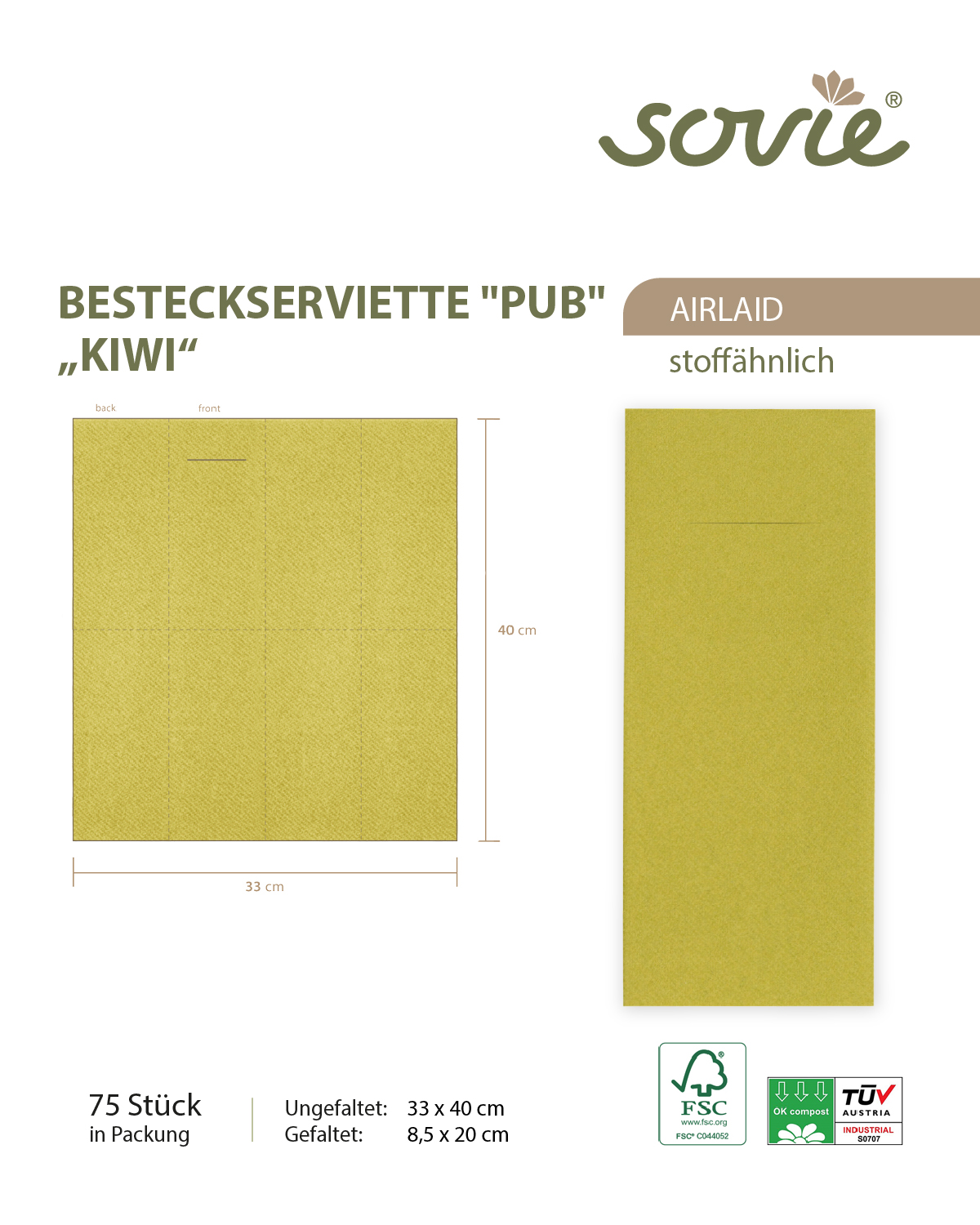 Im praktischen 75er-Pack bietet die Besteckserviette "Pub" in KIWI eine wirtschaftliche Lösung für Ihre Veranstaltung, Restaurant oder Hotel. Diese Serviette kombiniert modernes Design mit höchster Qualität und wird Ihrem Tisch nicht nur funktionale, sondern auch ästhetische Akzente verleihen. Setzen Sie auf die "Pub" Serviette, um Ihrer Veranstaltung oder Ihrem Lokal eine frische und einladende Atmosphäre zu verleihen.