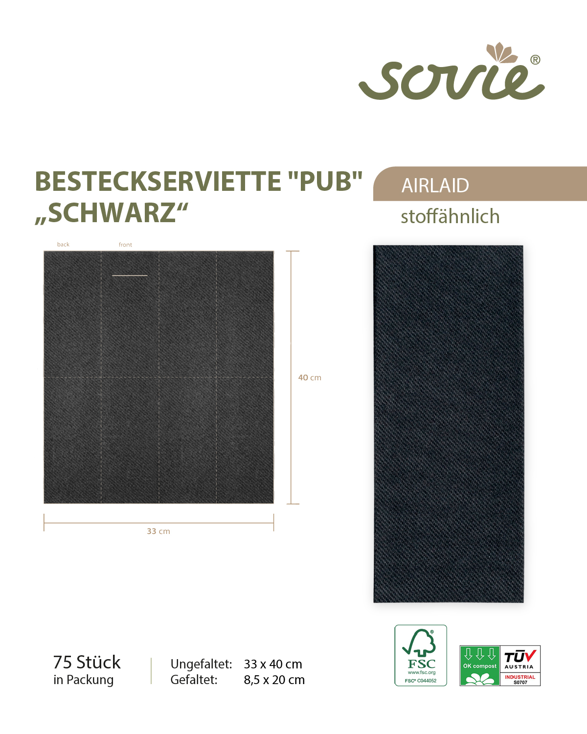 Besteckserviette Softpoint "Pub" in Schwarz, 40 x 33 cm, 1/8 Falz, 50 Stück