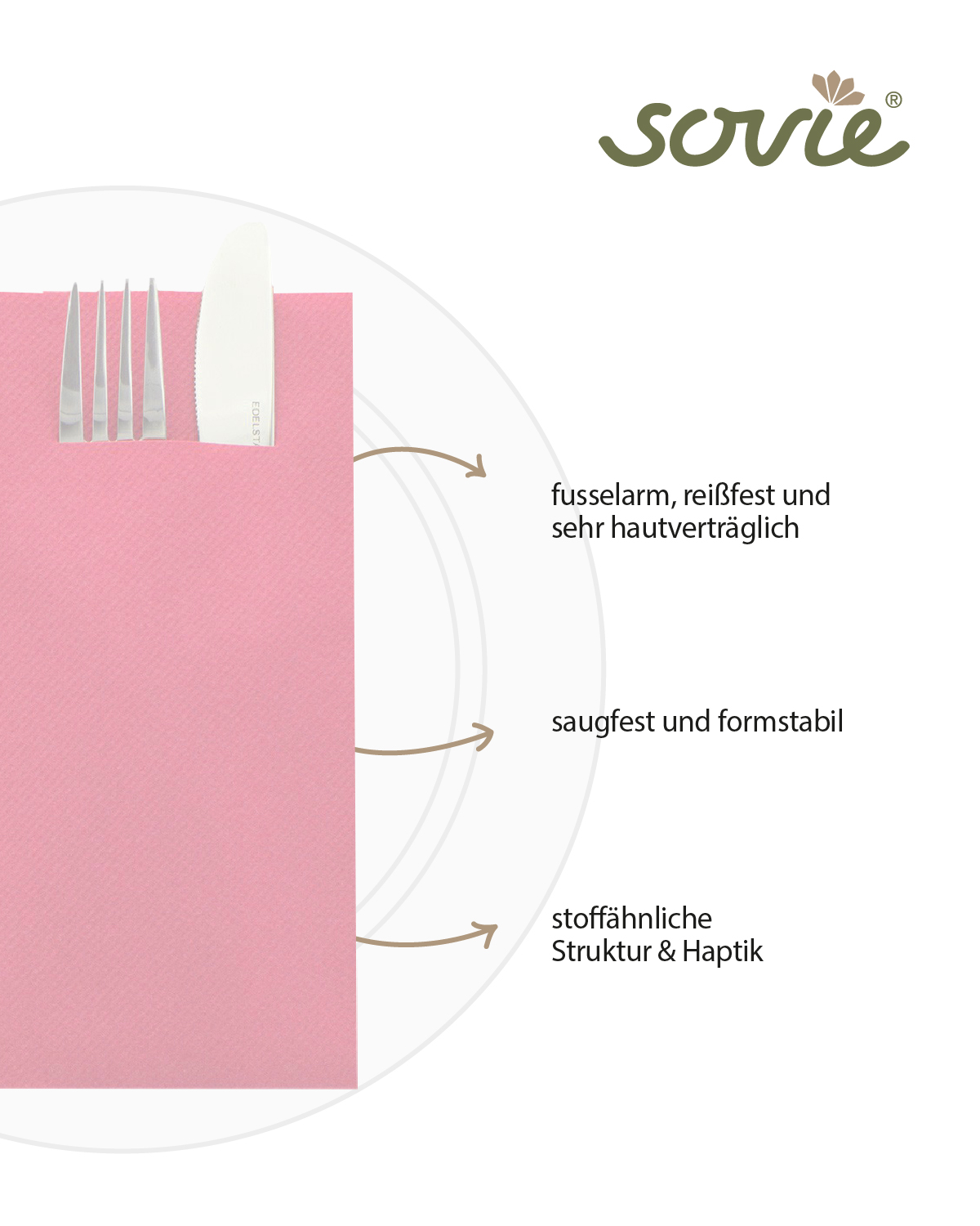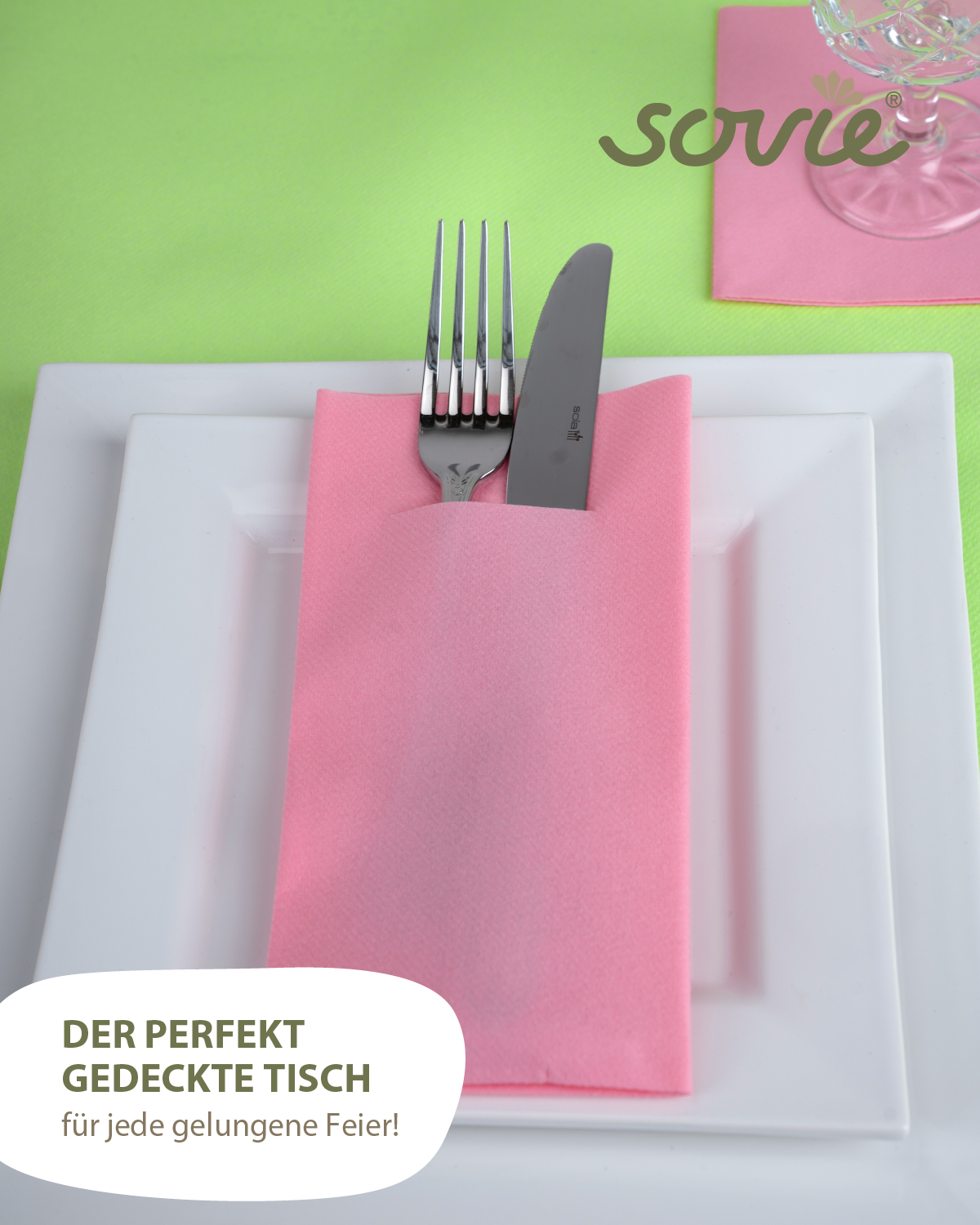 Feminin und zart zeigen sich unsere Tischprodukte mit dem Farbton ROSA. Solo oder in Kombination mit weiteren Produkten unseres Sortiments, ergeben sich individuelle Tischkreationen, ob für die Babyparty, Taufen oder Kindergeburtstage! Funktionalität und Design in perfekter Symbiose – bei den SOVIE® Bestecktaschen aus dem Hause Mank verbindet sich der Komfort einer vollwertigen Serviette mit der Funktion einer hygienischen Besteckaufbewahrung. Unsere Bestecktaschen sind weltweit patentiert und bilden nicht nur eine tolle Alternative zur herkömmlichen Serviette, sondern sind auch besonders hygienisch und lassen sich problemlos vorbereiten. Aus stoffähnlichem Linclass®-Airlaid gefertigt und in vielen verschiedenen Designs erhältlich, sind unsere Bestecktaschen der ideale Begleiter für Ihre Gartenparty!