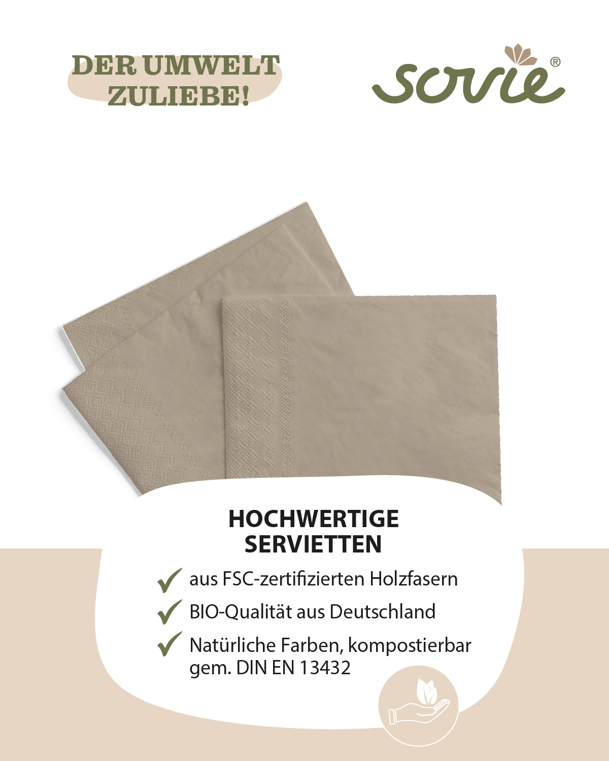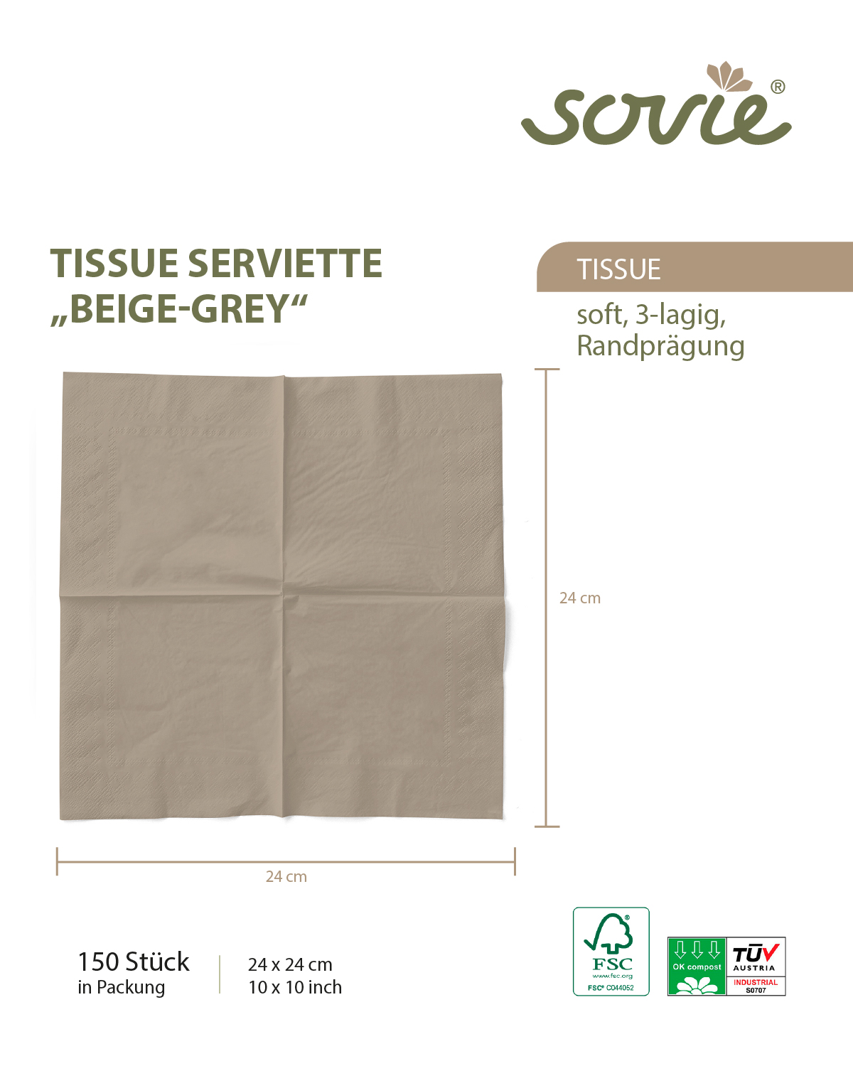 Hergestellt aus hochwertigem Tissue-Material sind diese Servietten angenehm weich und dennoch strapazierfähig genug, um den Anforderungen Ihrer Veranstaltung standzuhalten. Die dezente Beige-Grau-Farbe verleiht Ihrem Tisch eine zeitgemäße und ansprechende Atmosphäre, perfekt für moderne Veranstaltungen oder minimalistische Tischdekorationen.