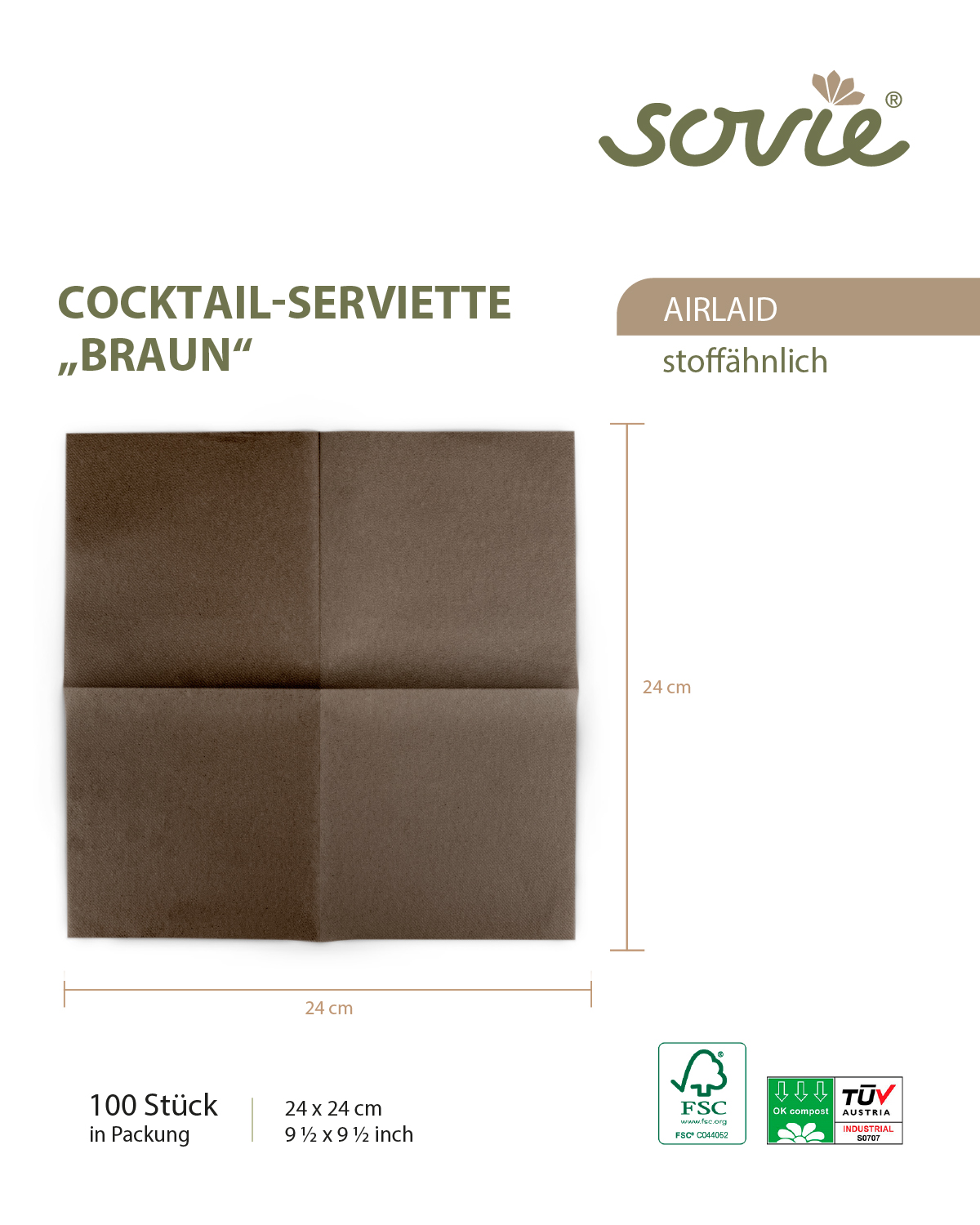 Cocktail-Servietten Naturbraun aus Linclass® Airlaid 24 x 24 cm, 100 Stück