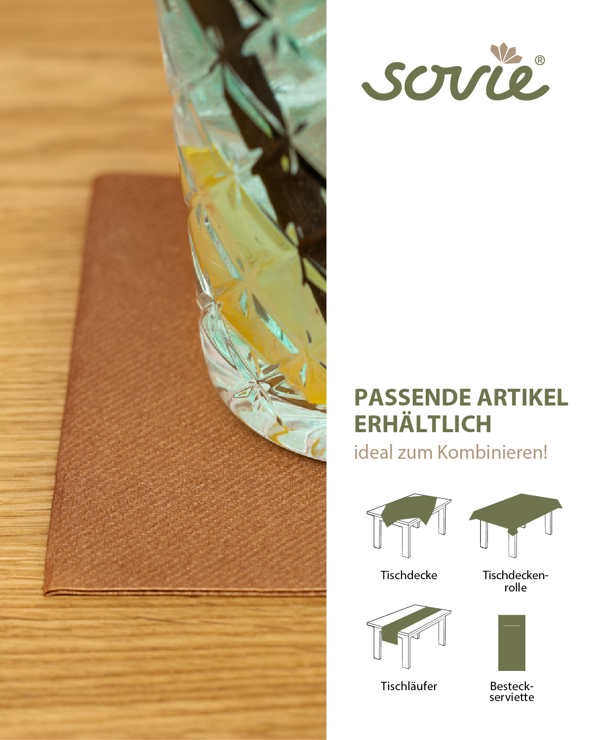 Eine Feierlichkeit mit mehreren Gästen steht bevor und die Tischgestaltung soll unkompliziert und zugleich hochwertig werden? Egal, ob privat oder für die Gastronomie, ob zur Hochzeit Familienfesten, diversen Partys oder Events – unsere Servietten in der Farbe BRONZE wirken mit ihrem durchgefärbten, textilähnlichen Airlaid-Material ebenso edel wie Stoffservietten, kosten Sie aber weniger Zeitaufwand und Geld.