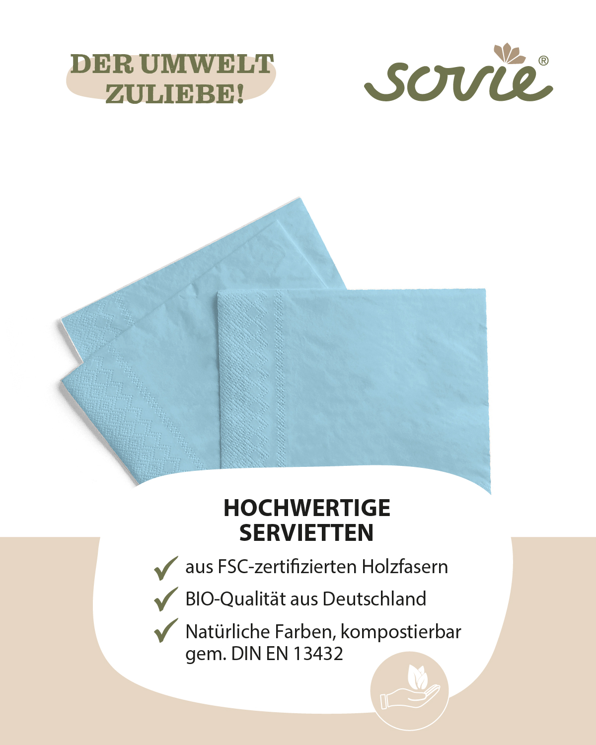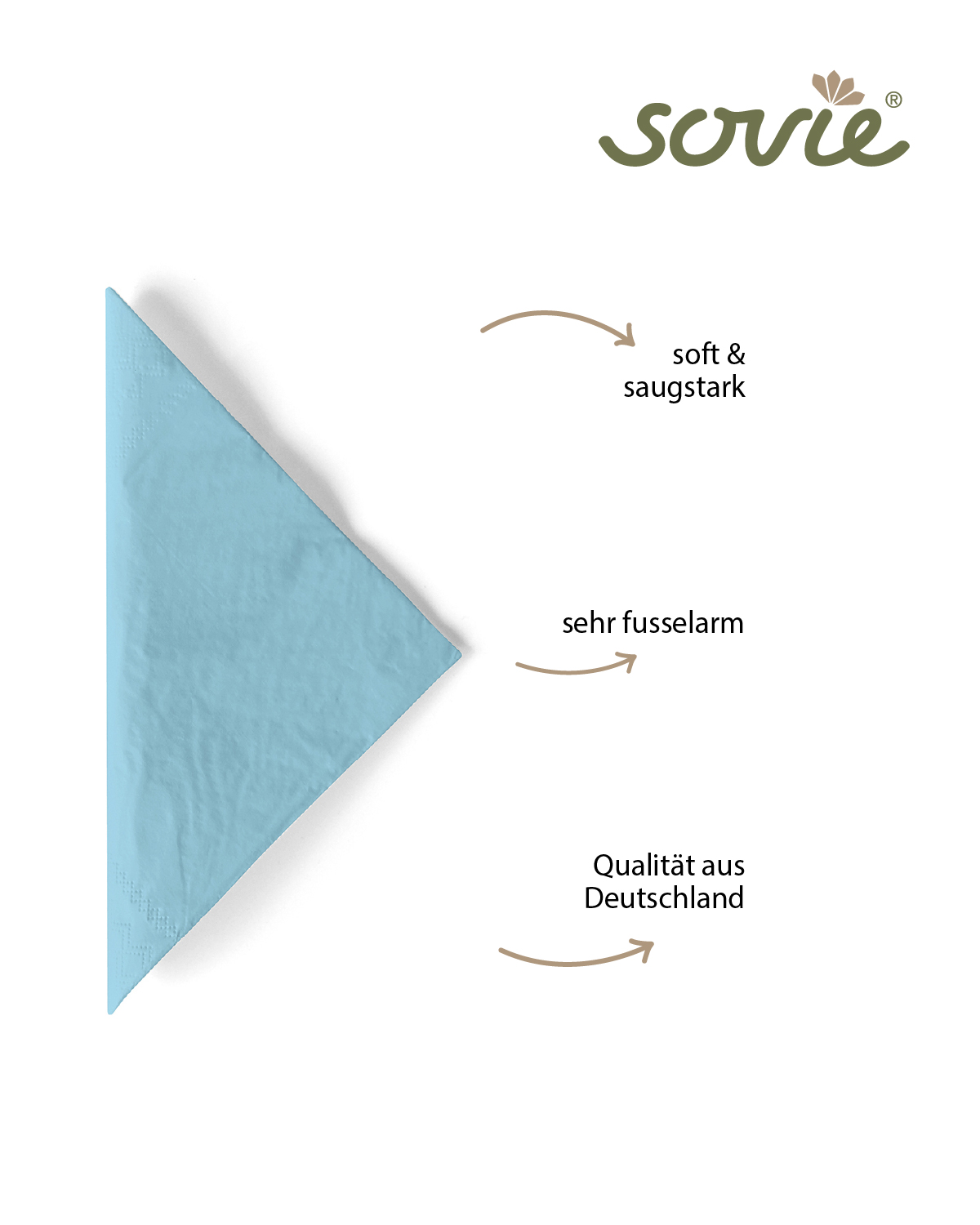 Hergestellt aus hochwertigem Tissue-Material sind diese Servietten angenehm weich und dennoch strapazierfähig genug, um den Anforderungen Ihrer Veranstaltung standzuhalten. Die zarte Hellblau-Farbe verleiht Ihrem Tisch eine sanfte und beruhigende Atmosphäre, ideal für Sommerpartys, Babypartys oder entspannte Treffen mit Freunden.