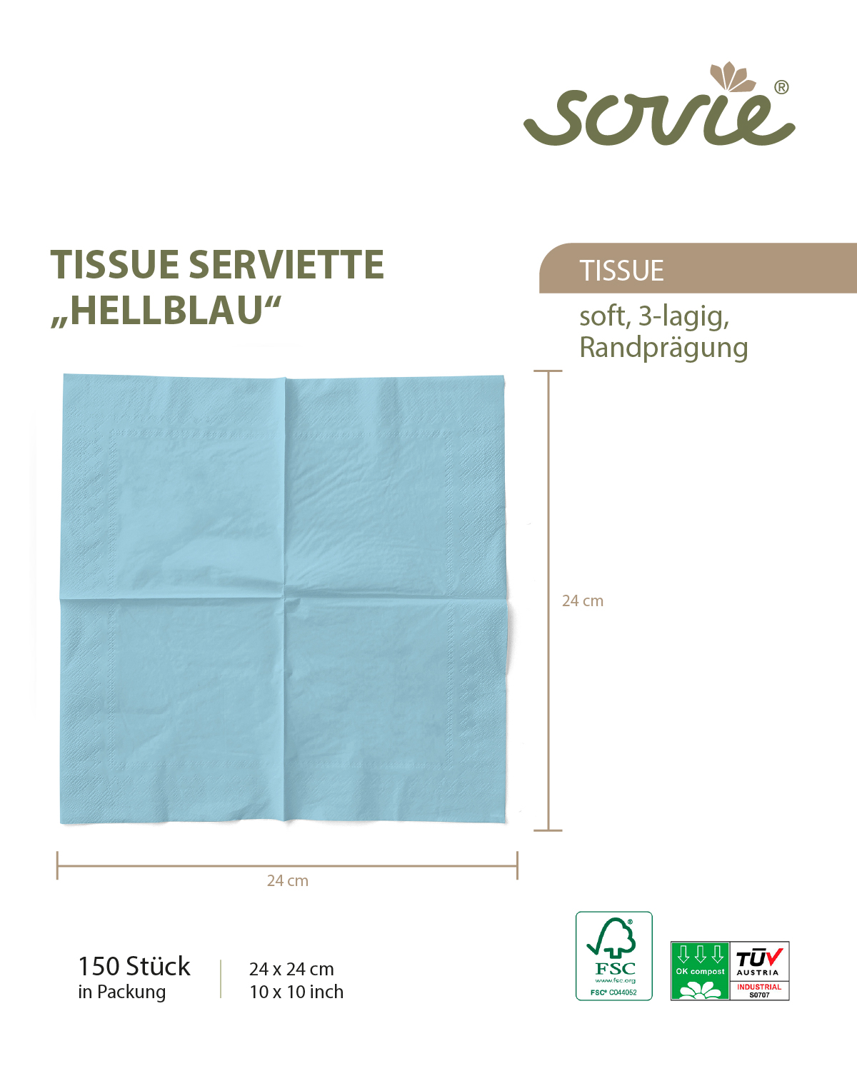 Verleihen Sie Ihren Cocktails und Getränken mit unseren Tissue Cocktailservietten in zartem Hellblau eine luftige und erfrischende Note! Speziell für Cocktails und kleinere Getränke konzipiert, bieten diese Servietten mit einer Größe von 24 x 24 cm eine ideale Lösung, um Tropfen und Spritzer stilvoll aufzufangen.