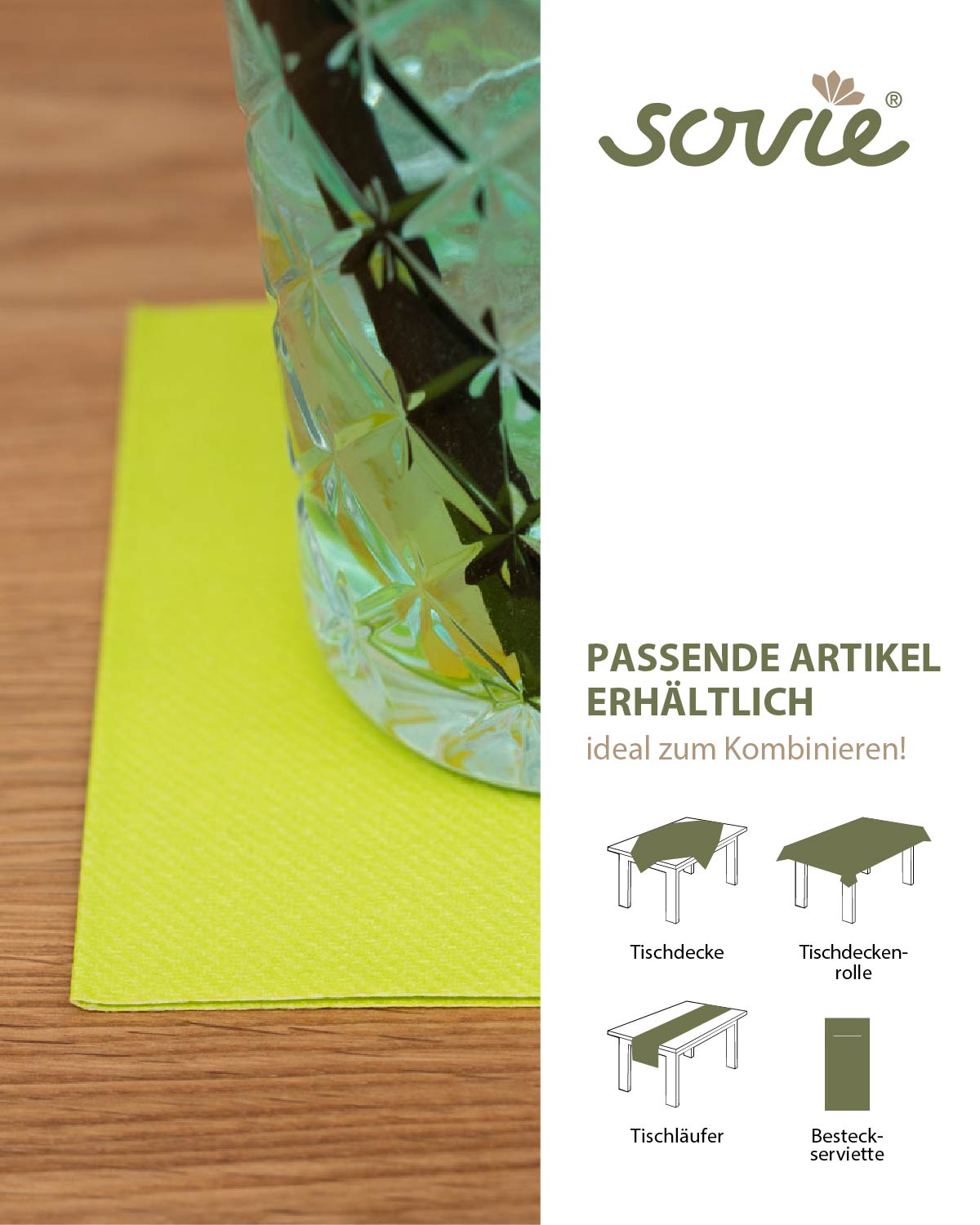Der fröhliche Farbton unserer Tischprodukte im Farbton LIME ist wie geschaffen für Ihre fantasievollen Tischdesigns. Auch in der Kombination mit weiteren unifarbigen Produkten unseres Sortiments, oder mit einem unserer Designs, lassen sich individuelle und immer neue Dekorationsideen verwirklichen.