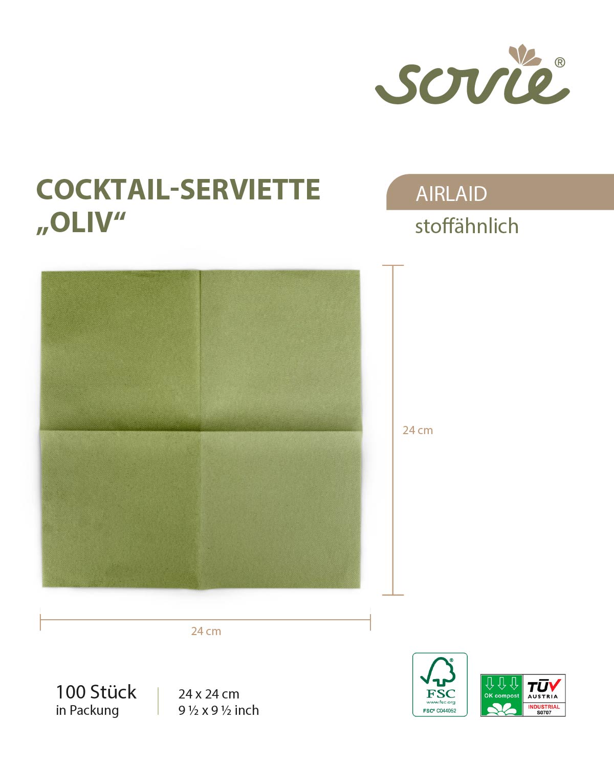 Serviette in Oliv aus Tissue 3-lagig, 1/4 Falz, 33 x 33 cm, 100 Stück