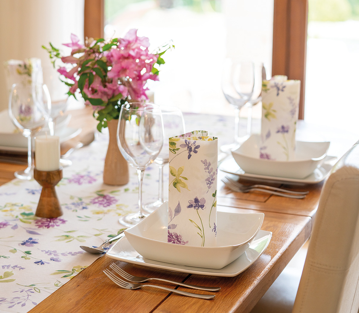 Das florale Blütendesign sorgt für eine frische und zugleich edle Atmosphäre. Zarte Farbtöne in Altrosa, Kiwi und Amethyst entfalten sich auf einem weißen Hintergrund und verleihen jeder Tafel eine harmonische, moderne Ausstrahlung. Ob für Hochzeiten, Geburtstage, Gartenfeste oder saisonale Dekorationen im Frühling und Sommer – dieser Tischläufer setzt stilvolle Akzente.