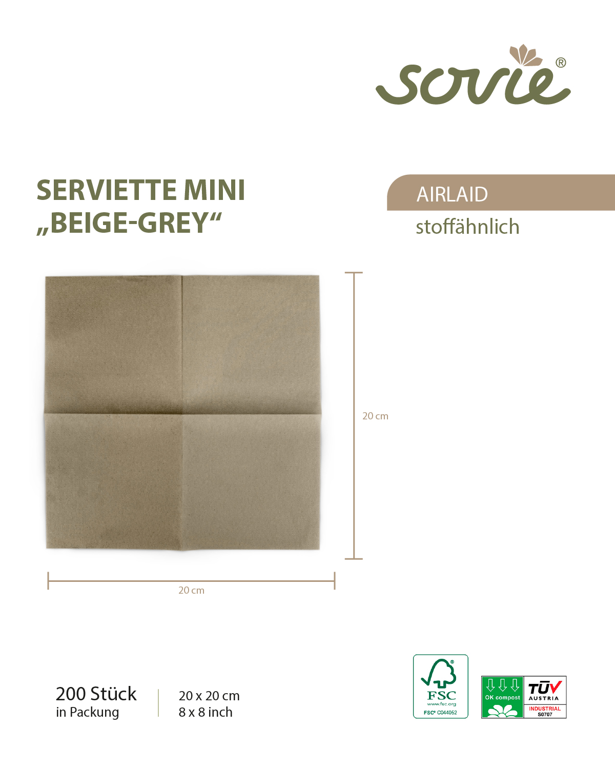 Mit 200 Stück pro Verpackungseinheit sind diese Mini-Servietten in BEIGE GREY optimal für professionelle Events, Caterings, Hotels oder den stilvollen Privatgebrauch. Sie bieten eine nachhaltige, praktische und ästhetische Lösung für den modernen Tisch.