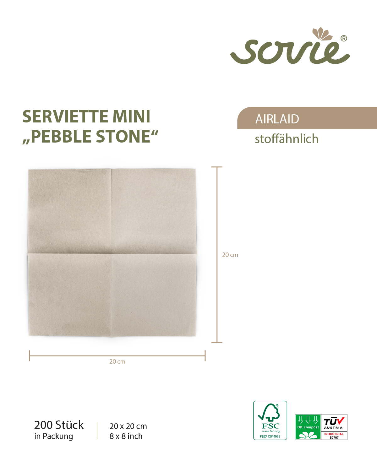 Die Mini Cocktail-Serviette in der Farbe PEBBLE STONE vereint stilvolle Zurückhaltung mit natürlicher Eleganz. Ihr dezenter, warm-grauer Farbton mit steiniger Nuance harmoniert perfekt mit modernen Tischkonzepten, sei es im Gastronomiebereich, auf Events oder im privaten Rahmen. Die Farbe PEBBLE STONE schafft eine ruhige, edle Atmosphäre und lässt sich ideal mit Holz-, Natur- oder Metallic-Elementen kombinieren.