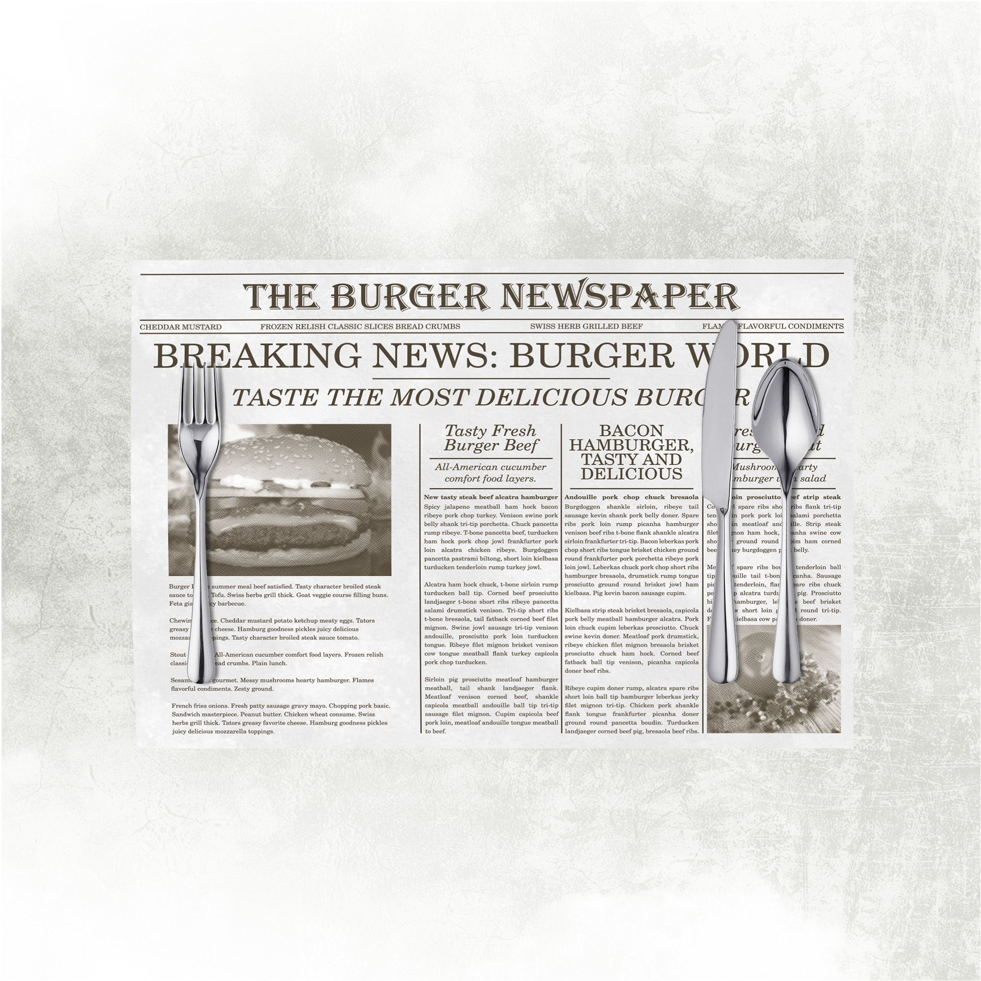 Breaking Burger News! Hier steht ihr Produkt im Fokus, denn das klassische Newspaper Design ist die moderne Verpackungs- und Service-Alternative für Burger und Co, deren ursprüngliches Verpackungsmaterial in den 50er Jahren aus Zeitungen bestand. Setzen Sie auf ein trendstarkes Table Top Design, dass Ihre Gäste begeistern wird! Die Tischsets mit dem Design Newspaper sind ideal für eine moderne Tischgestaltung im Diner oder Craft-Burger Restaurant. Aus strapazierfähigem Papier gefertigt, schützen sie die Tischoberfläche zuverlässig.
