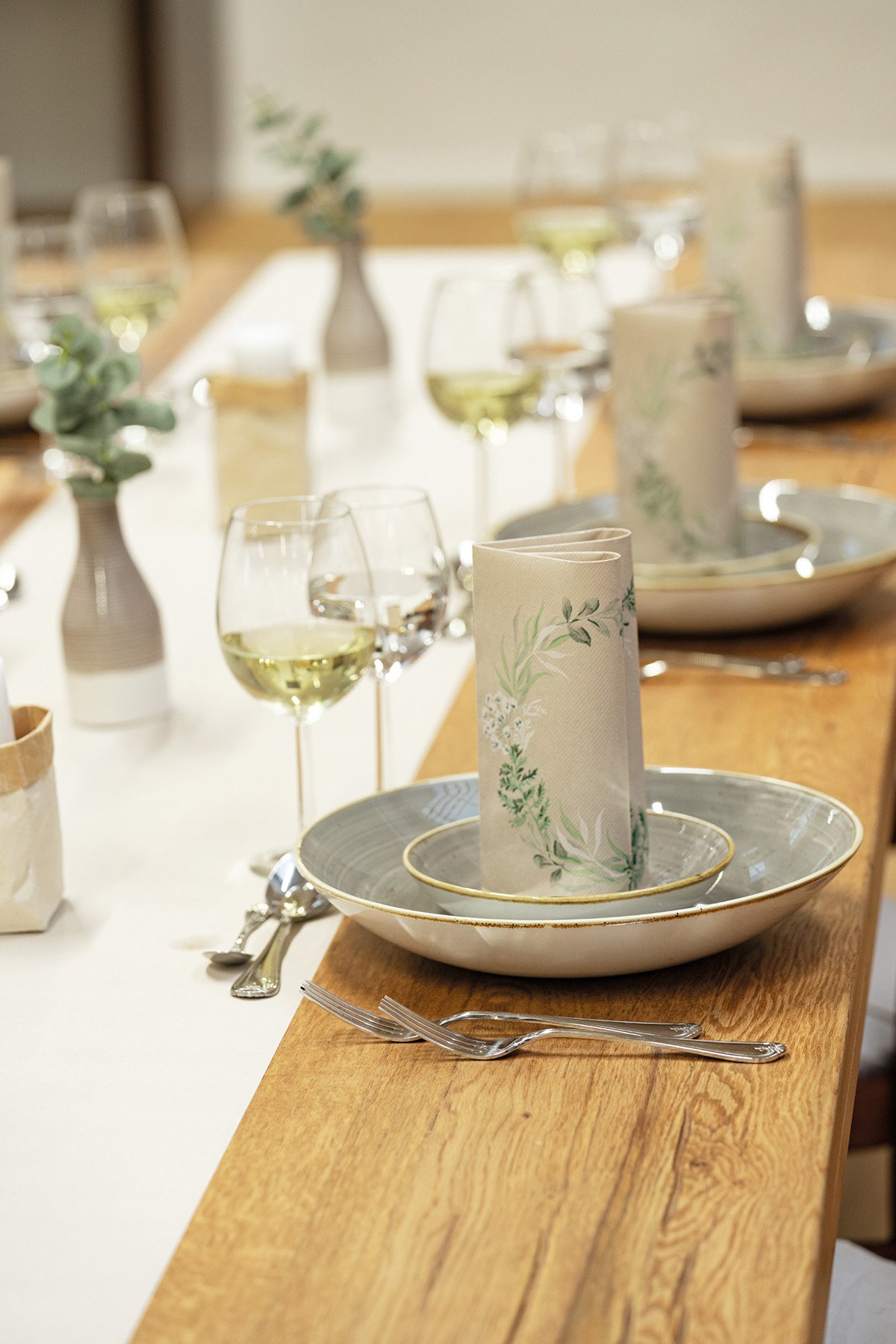 Das elegante Design mit einem Eukalyptuskranz auf beigefarbenem Hintergrund verleiht jeder Tischdekoration eine frische, botanische und zugleich harmonische Optik. Die Kombination aus sanften Naturtönen schafft eine ruhige und stilvolle Atmosphäre und eignet sich perfekt für Hochzeiten, Gartenpartys, Geburtstage oder festliche Events im modernen Naturstil.
