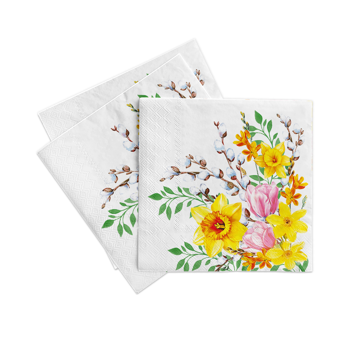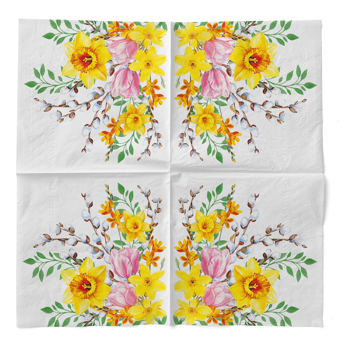 Das frühlingshafte Design mit Weidenkätzchen, gelben Narzissen und rosafarbenen Tulpen bringt eine frische und lebendige Atmosphäre auf den Tisch. Auf einem weißen Hintergrund kommen die floralen Elemente besonders gut zur Geltung und verleihen jeder Dekoration eine freundliche und einladende Note. Perfekt geeignet für Frühlings- und Osterfeiern, aber auch für Geburtstage, Gartenfeste und andere festliche Anlässe.
