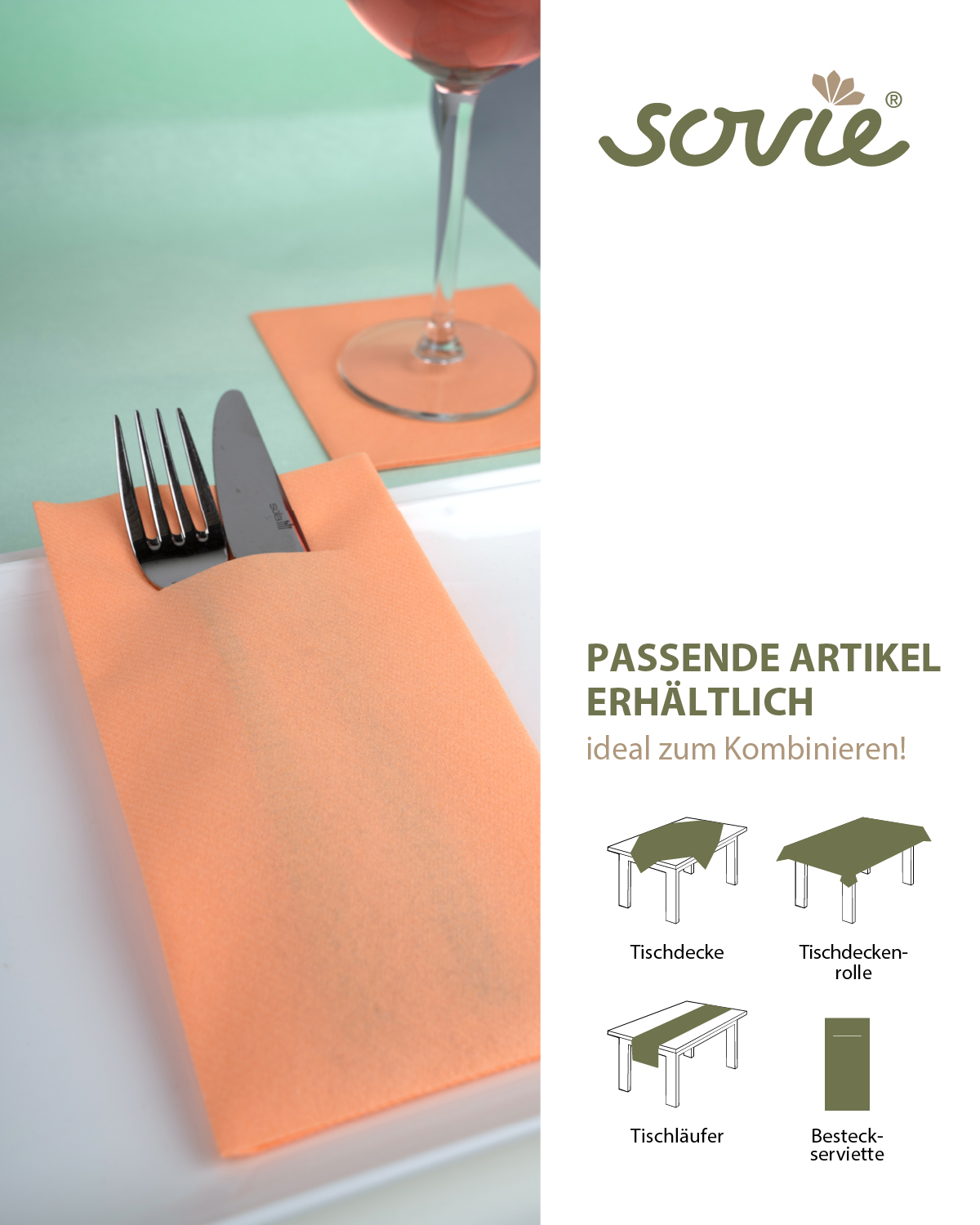 Sanft und dezent präsentieren sich unsere Produkte mit der Farbe APRIKOT, die sich auch mit weiteren Farben unseres unifarbigen Sortiments kombinieren lassen. Gestalten Sie mit diesem freundlichen Farbton stimmige Dekorationen, die Ihre Gäste begeistern werden! Verwandeln Sie mit diesem Design Ihre Tische in stilvolle Dekorationswelten, die Sie mit unseren unifarbigen Produkten kombinieren können! Unsere bewährte Linclass-Airlaid Qualität, stoffähnlich in Griff und Optik, garantiert einen Hauch von Luxus auf Ihren Tischen!