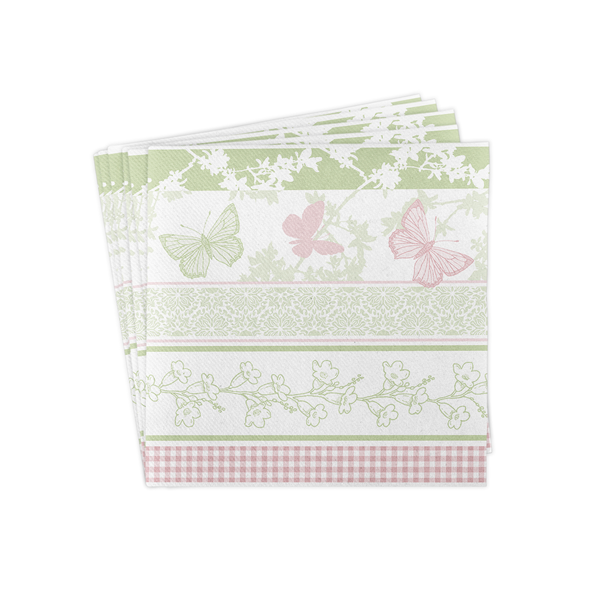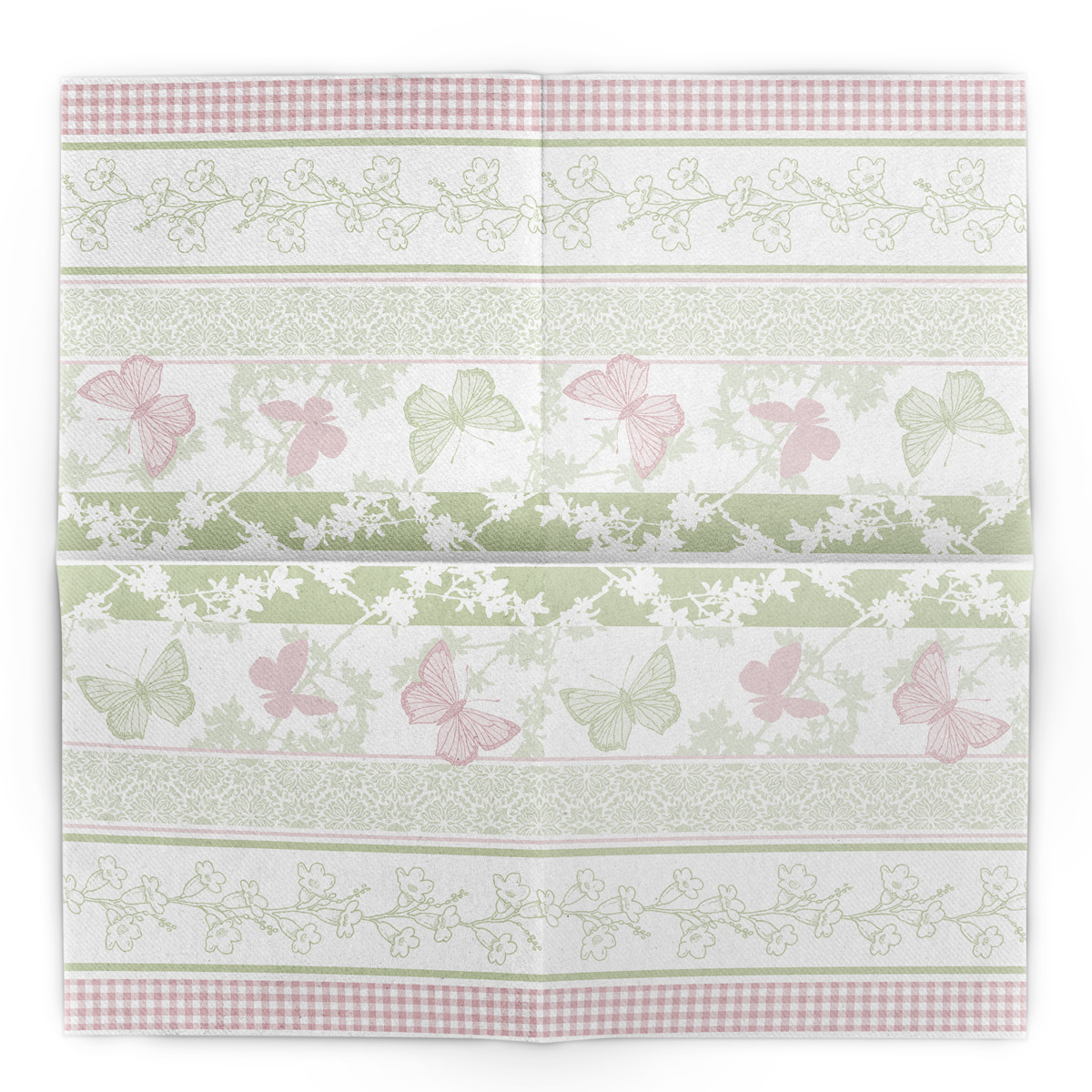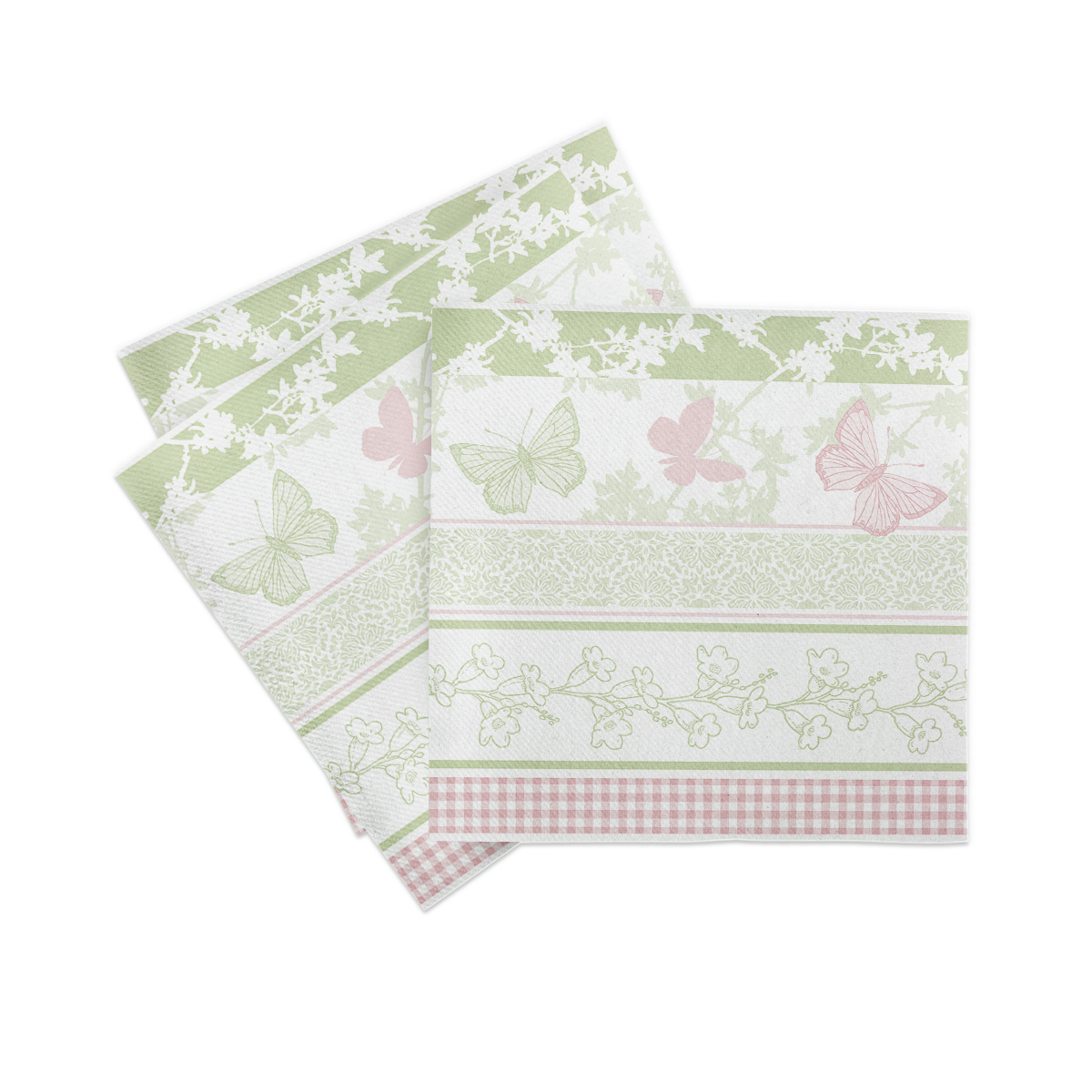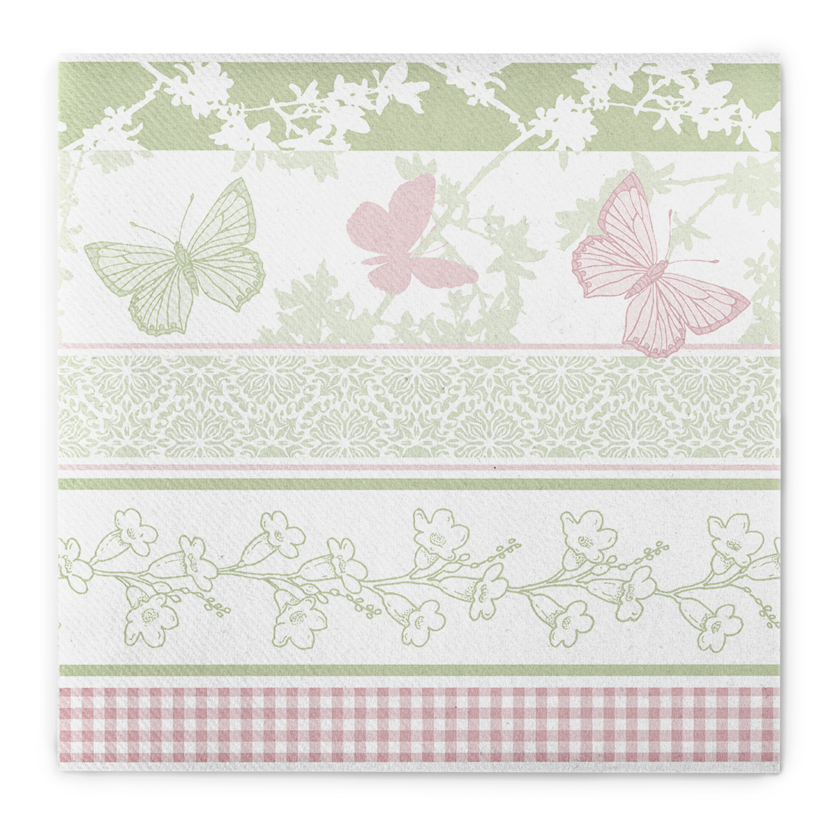 Das liebevoll gestaltete Design mit Blütenornamenten, feinem Karorand und zarten Schmetterlingen verleiht jeder Tischdekoration eine frische und elegante Note. Die harmonischen Pastellfarben in Salbei und Rose auf weißem Hintergrund schaffen eine leichte, freundliche Atmosphäre und passen perfekt zu Frühlings- und Sommeranlässen sowie zu festlichen Gelegenheiten wie Hochzeiten oder Geburtstagen.