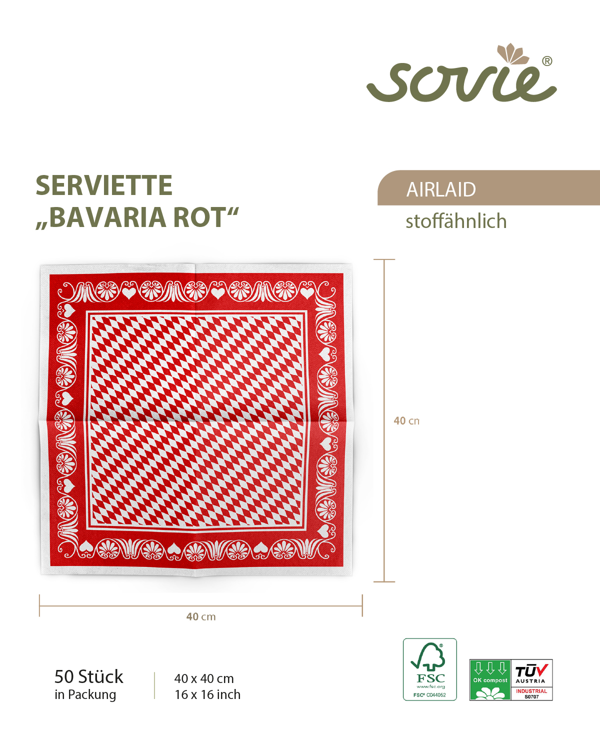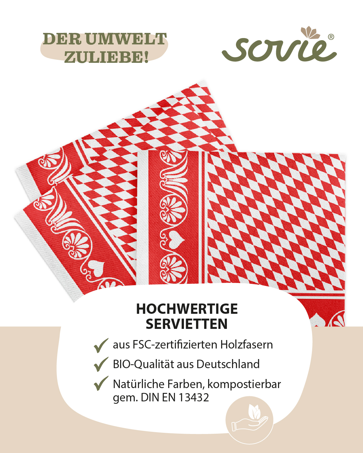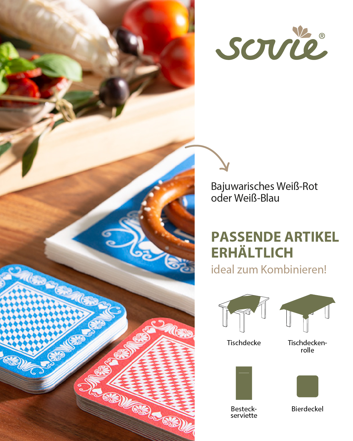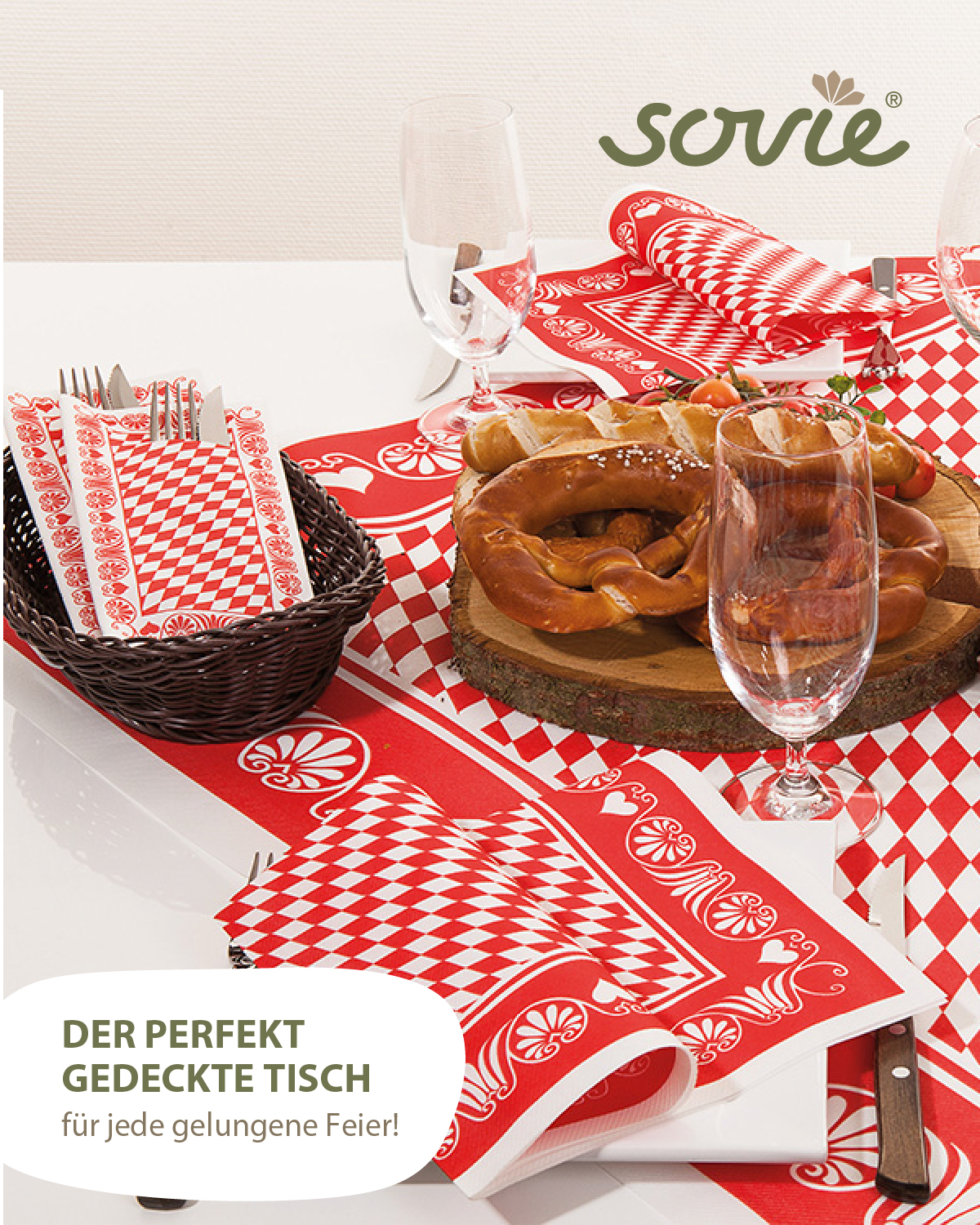 Das Design der BAVARIA Serviette besticht durch das klassische rot-weiße Rautenmuster, das sofort an bayerische Traditionen und Festlichkeiten erinnert. Ergänzt durch eine elegante Ornament-Bordüre, verleihen diese Servietten Ihrer Tischdekoration eine traditionelle und zugleich stilvolle Note. Ob bei einem Oktoberfest, einer bayerischen Themenparty oder einer festlichen Veranstaltung – die Airlaid Serviette BAVARIA fügt sich nahtlos in jede festliche Atmosphäre ein und steigert die Vorfreude auf köstliche Speisen und gesellige Stunden.