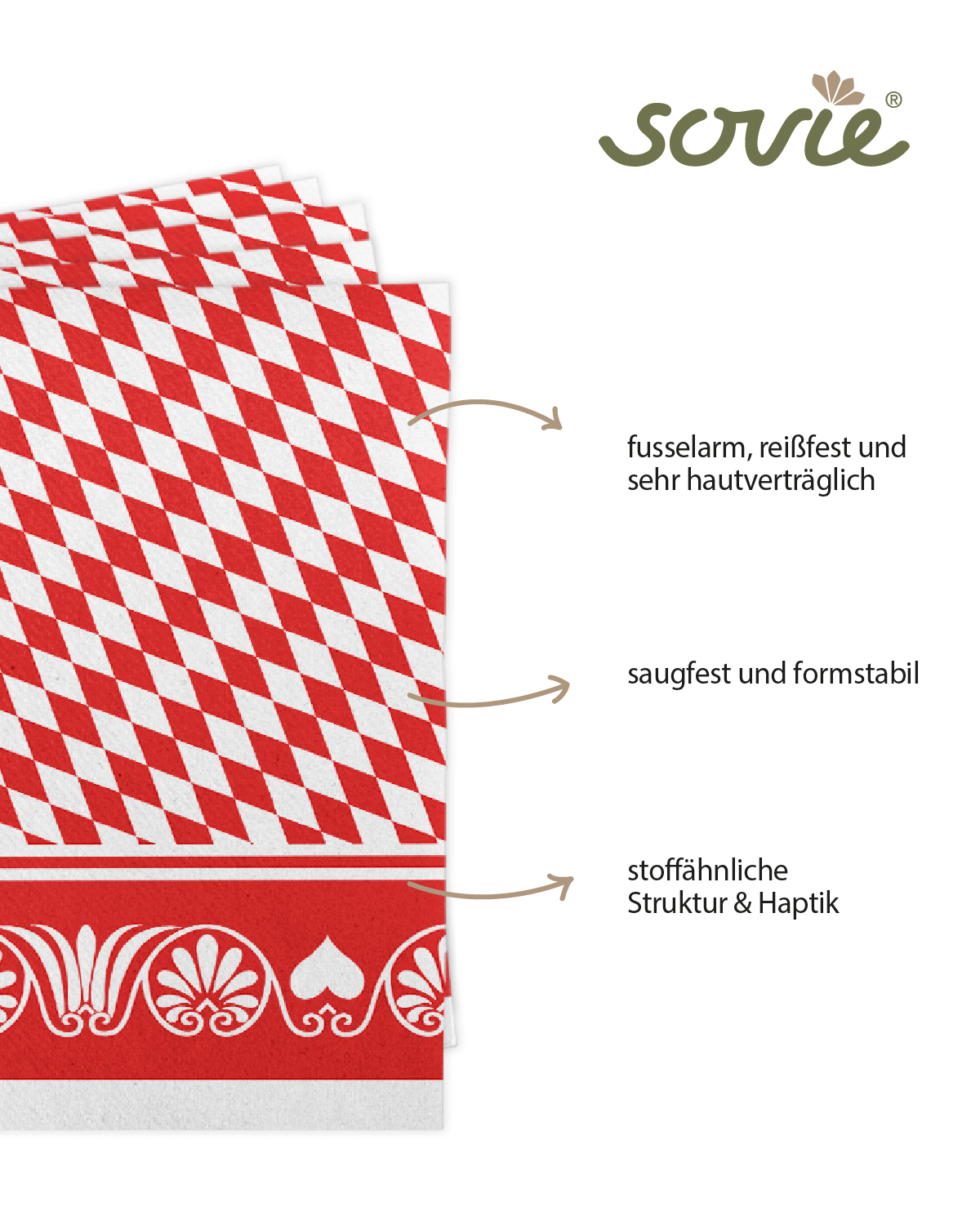 Dank ihrer hohen Qualität und Benutzerfreundlichkeit sind Airlaid Servietten besonders saugfähig und reißfest, was sie ideal für den Umgang mit typischen bayerischen Gerichten und Getränken macht. Trotz ihrer Robustheit bieten die Servietten eine weiche und angenehme Haptik, die den Komfort für Ihre Gäste erhöht. Nach Gebrauch lassen sie sich einfach entsorgen, was die Reinigung nach der Feier erheblich erleichtert. Mit den Airlaid Servietten BAVARIA in Rot-Weiß kombinieren Sie traditionelle bayerische Ästhetik mit praktischer Handhabung, was sie zur perfekten Wahl für jede Veranstaltung mit bayerischem Charakter macht.