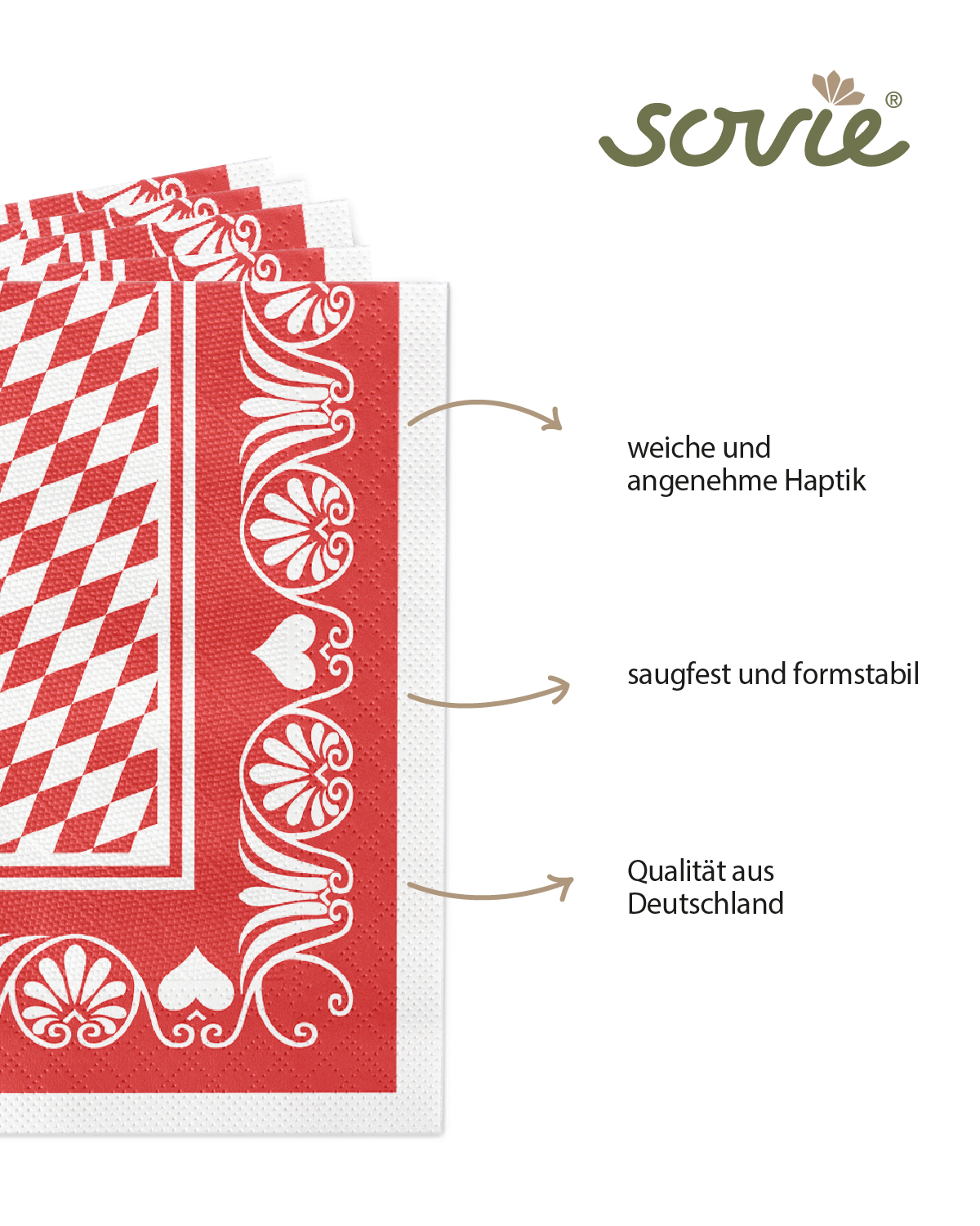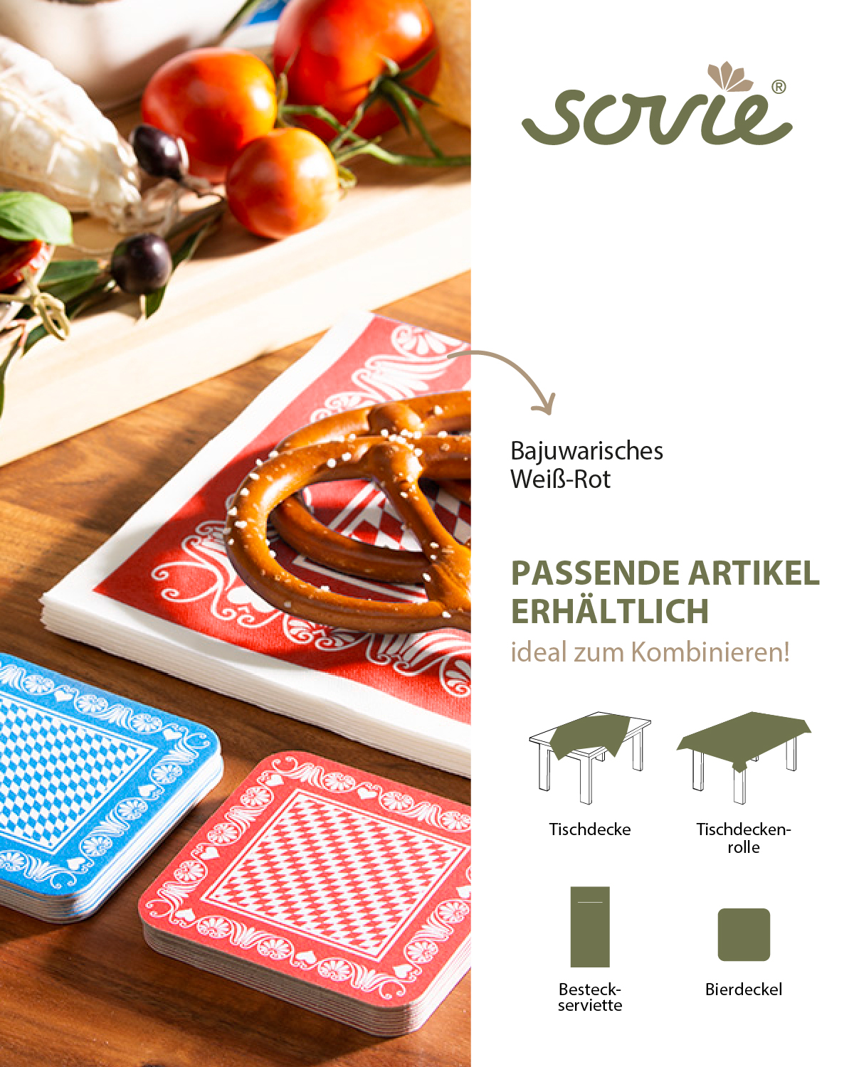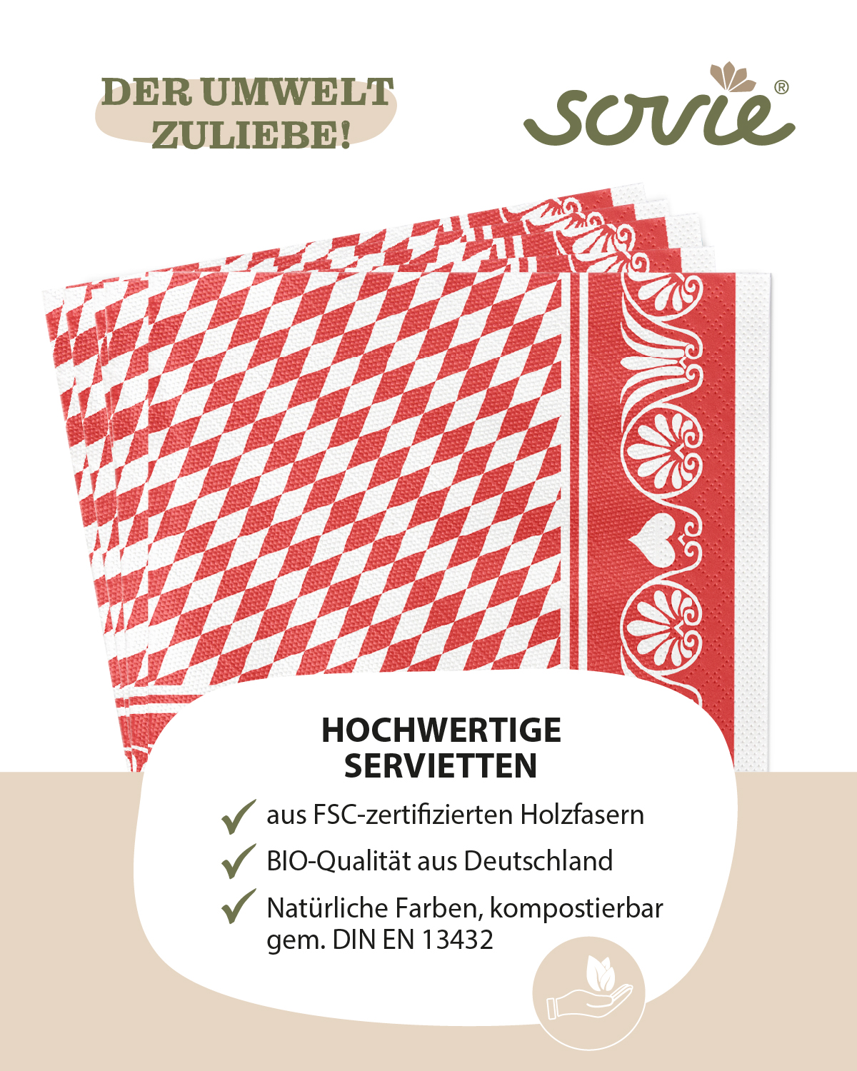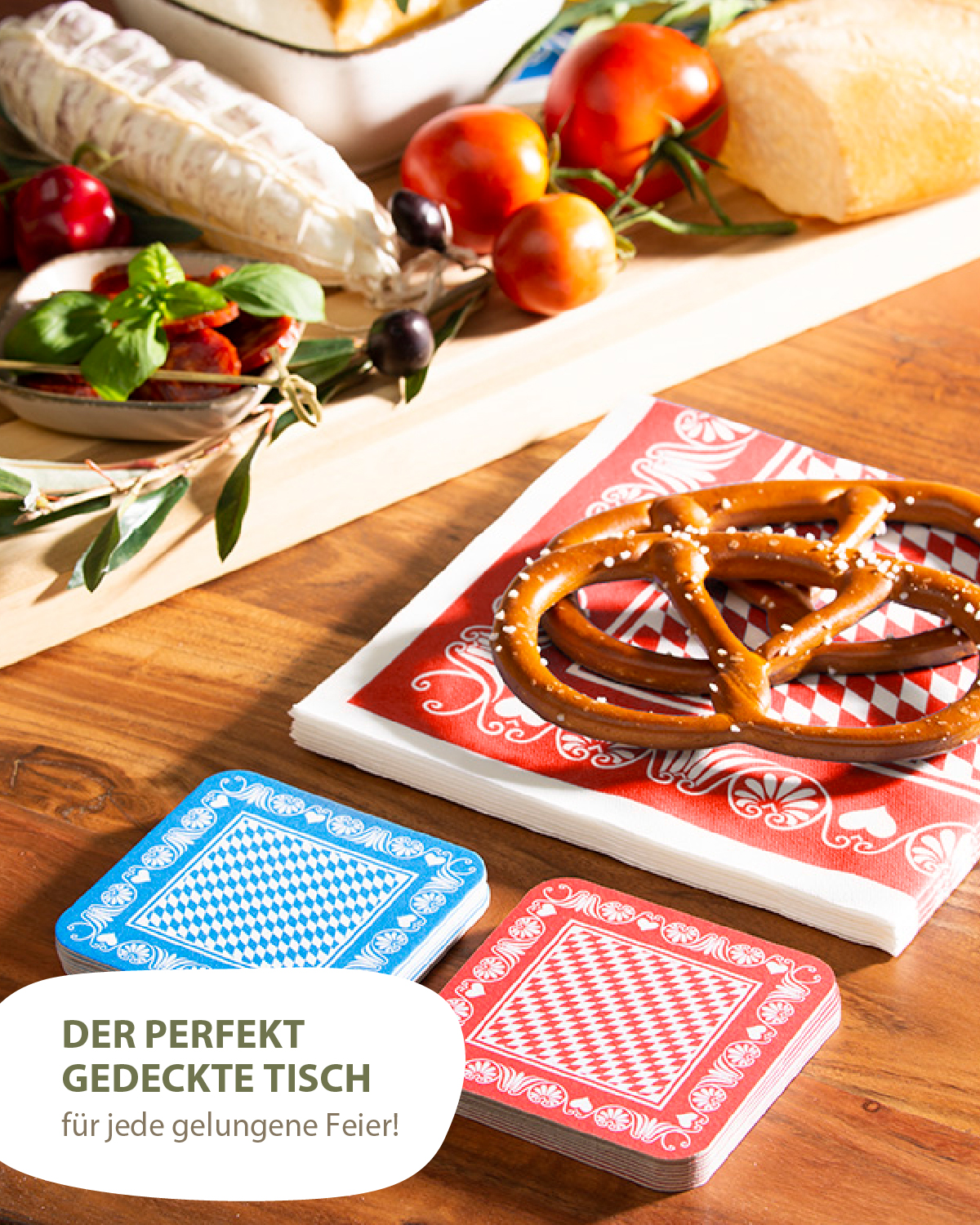 Die 4-lagige Ausführung sorgt für eine extra hohe Saugfähigkeit und Reißfestigkeit, wodurch diese Servietten besonders praktisch für den Umgang mit typischen bayerischen Gerichten und Getränken sind. Trotz ihrer Robustheit fühlen sich die Servietten angenehm weich an und bieten Ihren Gästen einen hohen Komfort. Nach Gebrauch lassen sie sich einfach entsorgen, was die Reinigung nach der Feier erheblich erleichtert. Mit den Tissue-Deluxe Servietten BAVARIA in Rot-Weiß kombinieren Sie traditionelle bayerische Ästhetik mit praktischer Handhabung, was sie zur perfekten Wahl für jede Veranstaltung mit bayerischem Flair macht.