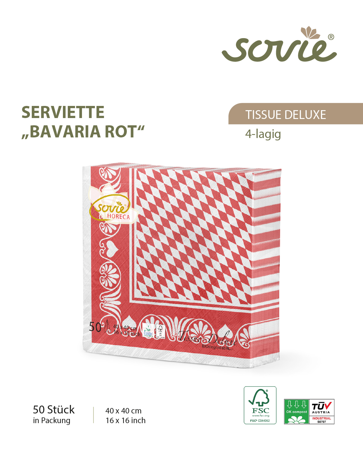 Die Tissue-Deluxe Serviette BAVARIA in Rot-Weiß verleiht Ihrer Tischdekoration einen Hauch von bayerischer Tradition und Eleganz. Mit einer Größe von 40 x 40 cm und einer 4-lagigen Struktur bieten diese Servietten sowohl eine ansprechende Optik als auch hervorragende praktische Eigenschaften. Verpackt in Einheiten zu 50 Stück, sind sie ideal für größere Veranstaltungen, bei denen sowohl Stil als auch Funktionalität im Vordergrund stehen.