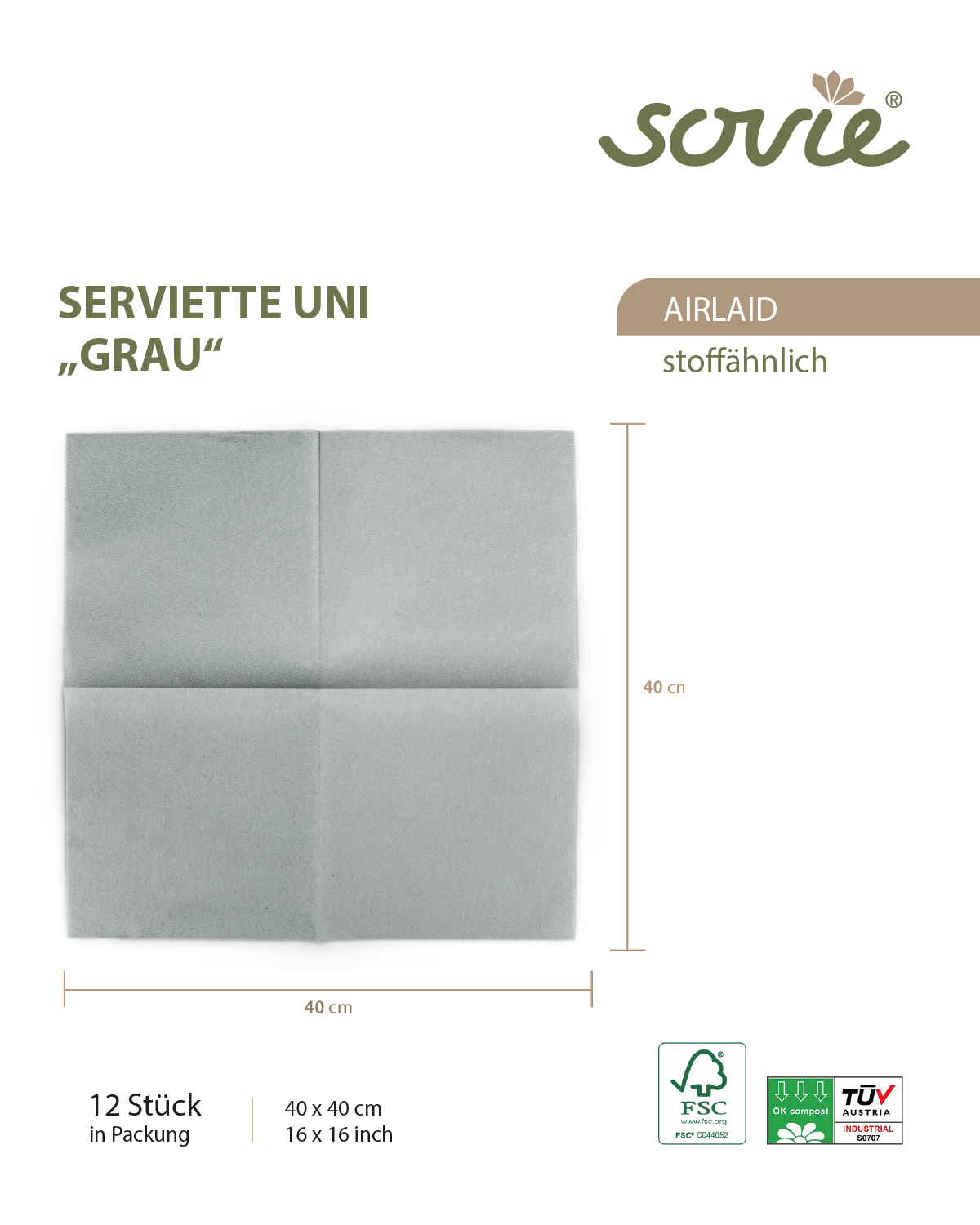 Die Packung enthält 12 Stück und bietet somit eine praktische Menge für kleinere Events oder als Ergänzung zu einem stilvollen Zuhause. Die Kombination aus edlem GRAU, hochwertigem Linclass® Airlaid und der komfortablen 1/4 Falz macht diese Serviette zur idealen Wahl für Gastgeber mit Geschmack.