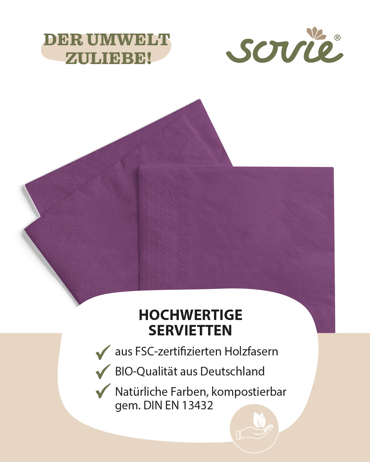 Unsere Tissue-Servietten in tiefem Aubergine sind die perfekte Wahl, um Ihrer Tischdekoration eine elegante und edle Note zu verleihen. Mit einer großzügigen Größe von 40 x 40 cm und einem praktischen 1/4-Falz-Design bieten sie ausreichend Platz und Funktionalität für Ihre Gäste.