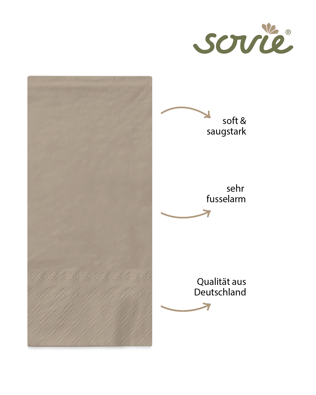 Hergestellt aus hochwertigem Tissue-Material sind diese Servietten angenehm weich im Griff und dennoch strapazierfähig genug, um den Anforderungen Ihrer Veranstaltung standzuhalten. Der dezente Beige-Grau-Ton verleiht Ihrem Tisch eine zeitlose Eleganz und passt zu einer Vielzahl von Dekorationsstilen und Themen.