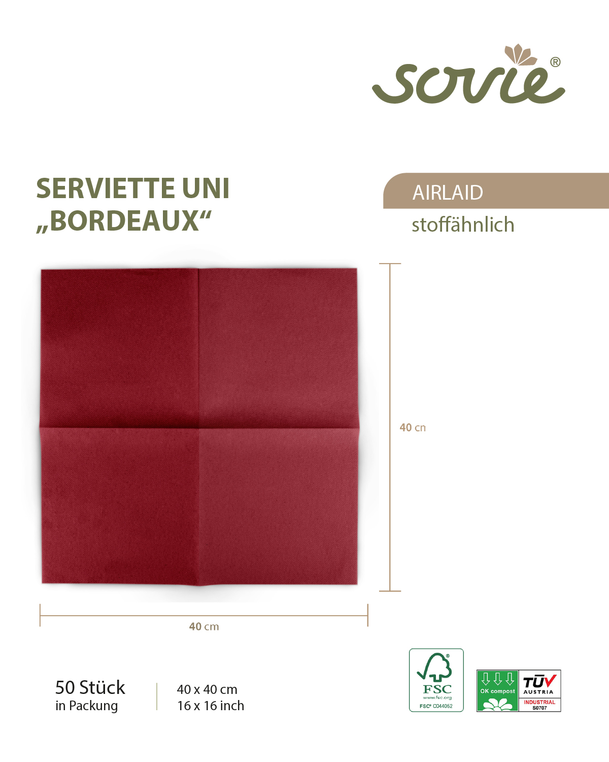 Das i-Tüpfelchen der Tischdekoration. Mit Servietten der Farbe BORDEAUX aus unserem unifarbenen Sortiment lassen sich individuelle Designträume verwirklichen und einzigartige Atmosphären erschaffen. Durch die Formstabilität lassen sie sich in beinahe jede Form bringen und avancieren so zum Star Ihrer Tischgestaltung. Kombinieren Sie unsere einfarbigen Servietten mit Produkten aus unserem umfangreichen Designprogramm! Unsere Tischprodukte in BORDEAUX zeugen von einer Eleganz, die sich in dem edlen Farbton wiederspiegelt.