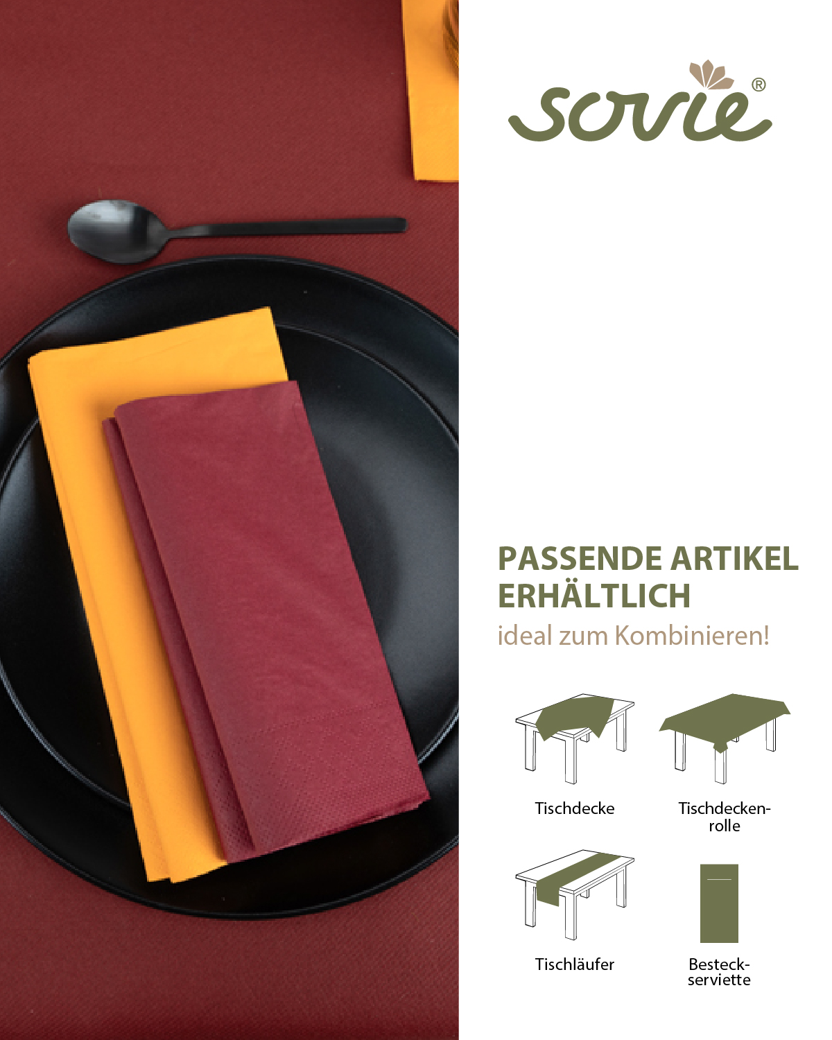 Unsere Tissue-Servietten in edlem Bordeaux sind die ideale Wahl, um Ihrer Tischdekoration eine raffinierte und ansprechende Note zu verleihen. Mit einer großzügigen Größe von 40 x 40 cm und einem praktischen 1/8-Falz-Design bieten sie ausreichend Platz und Funktionalität für Ihre Gäste.
