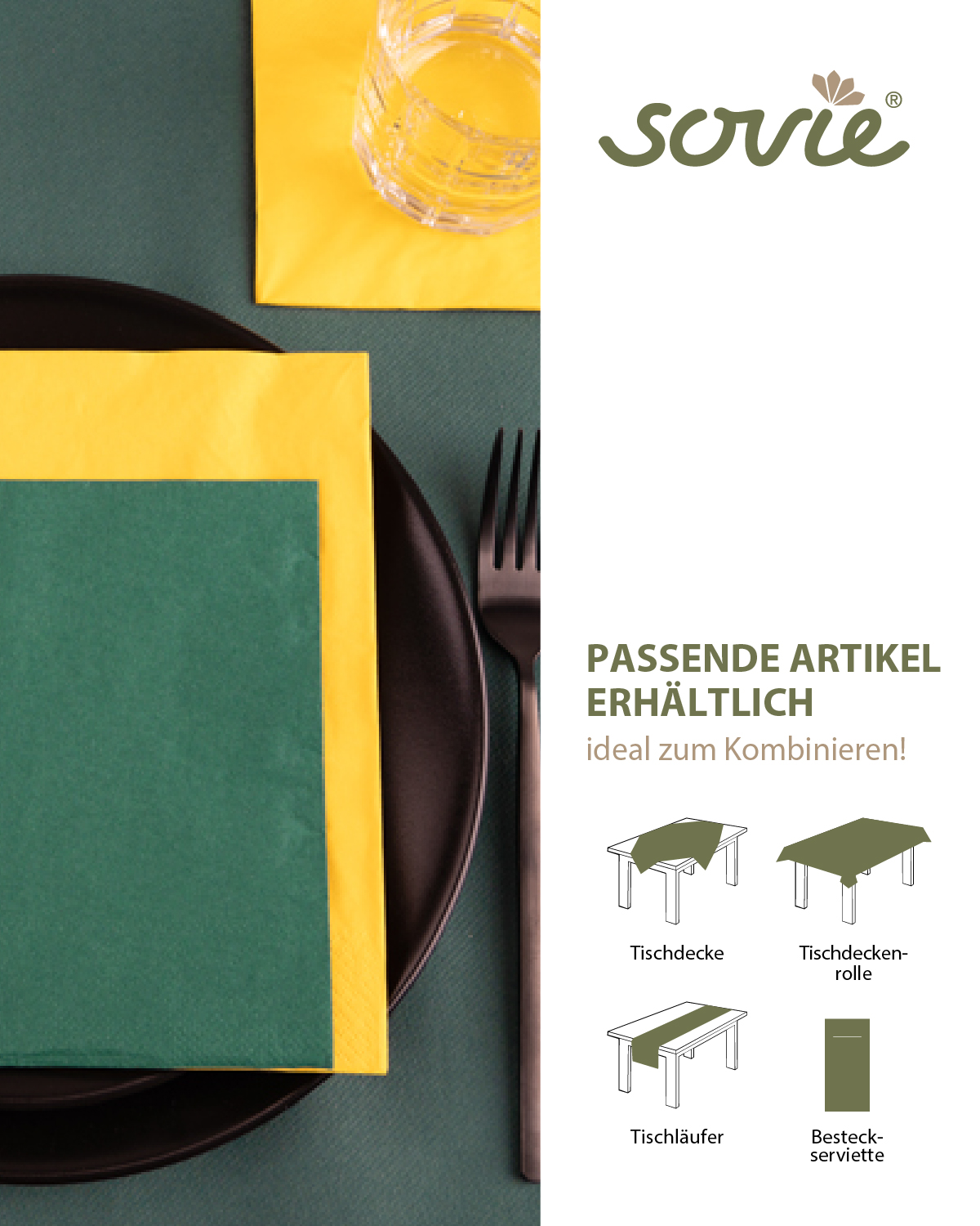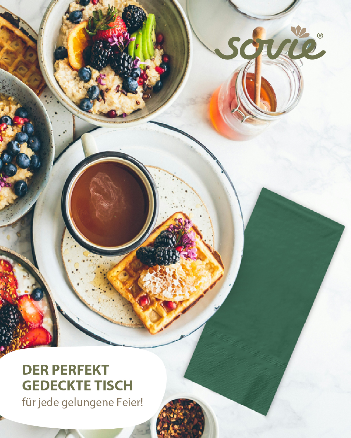 Hergestellt aus hochwertigem Tissue-Material sind diese Servietten angenehm weich im Griff und dennoch strapazierfähig genug, um den Anforderungen Ihrer Veranstaltung standzuhalten. Der satt-dunkle Grünton verleiht Ihrem Tisch eine warme und einladende Atmosphäre, perfekt für Herbst- und Winterfeiern, Waldhochzeiten oder gemütliche Abendessen.