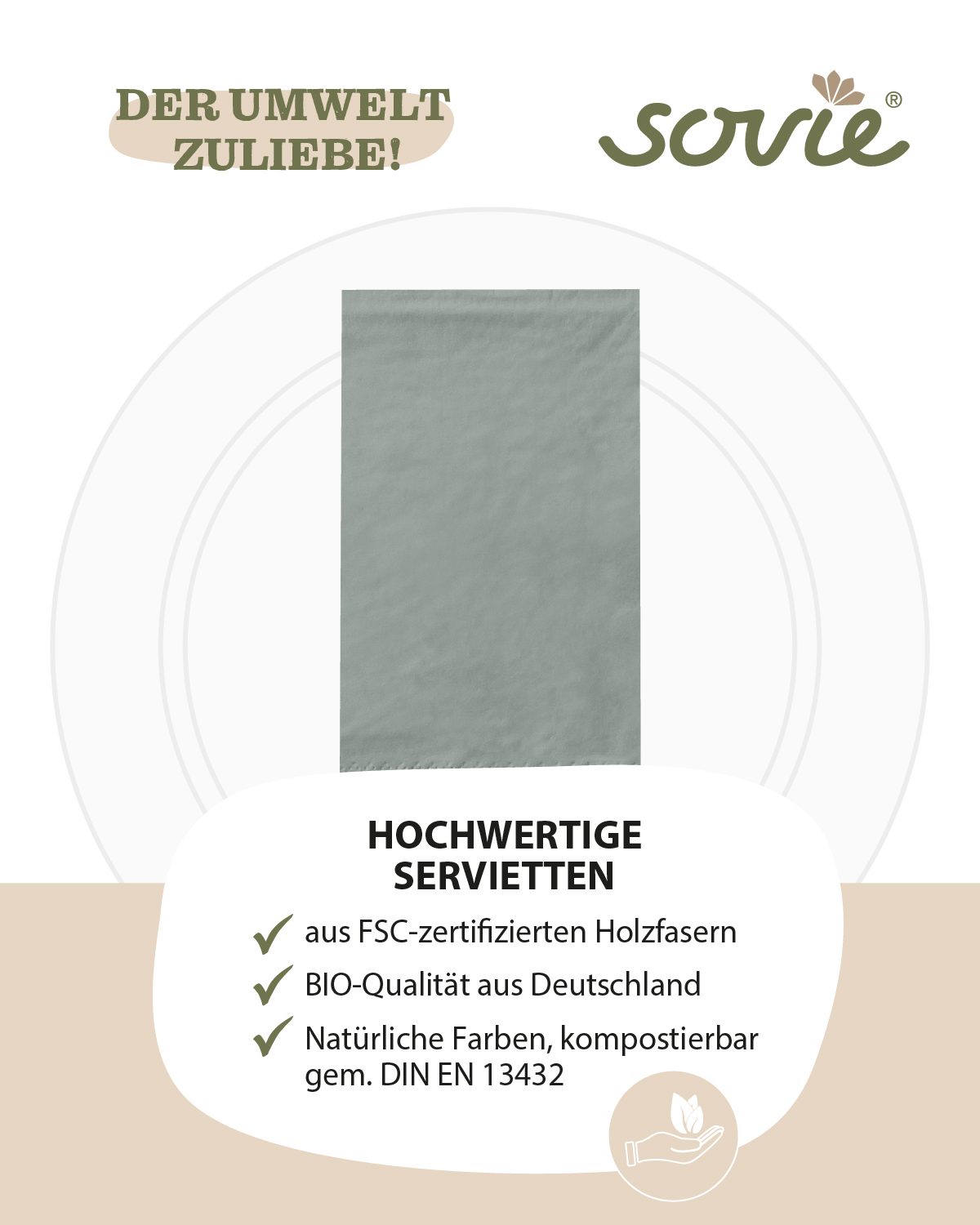 Serviette in Sand aus Tissue 3-lagig, 33 x 33 cm, 1/8 Falz, 100 Stück