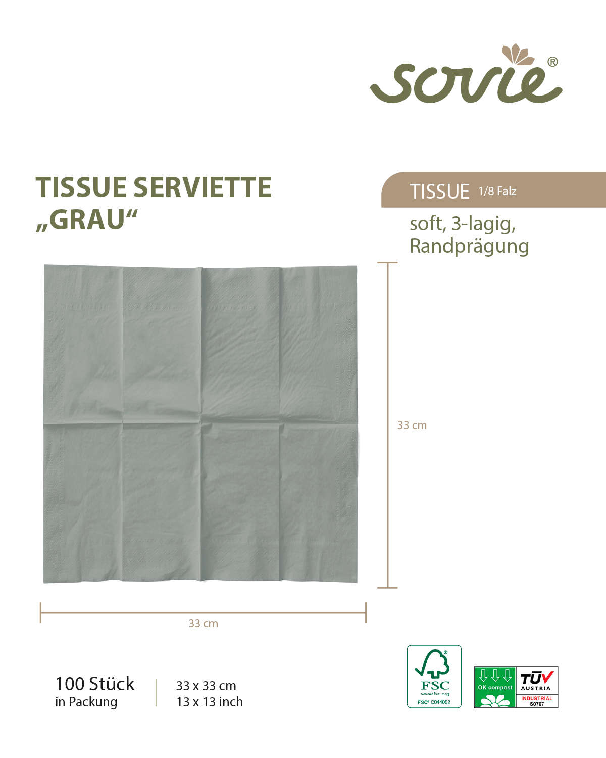 Serviette in Beige Grey aus Tissue 3-lagig, 33 x 33 cm, 1/8 Falz, 100 Stück