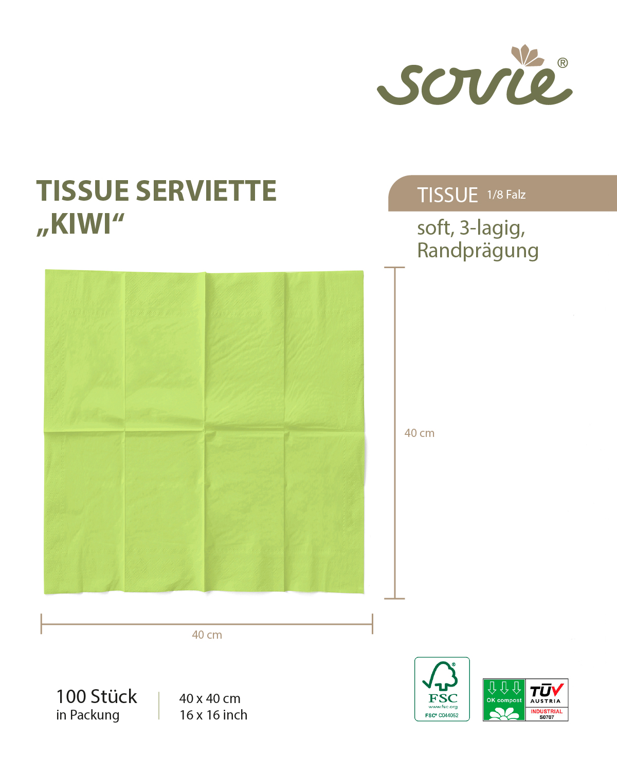 Serviette Kiwi aus Tissue Deluxe®, 4-lagig, 40 x 40 cm, 50 Stück