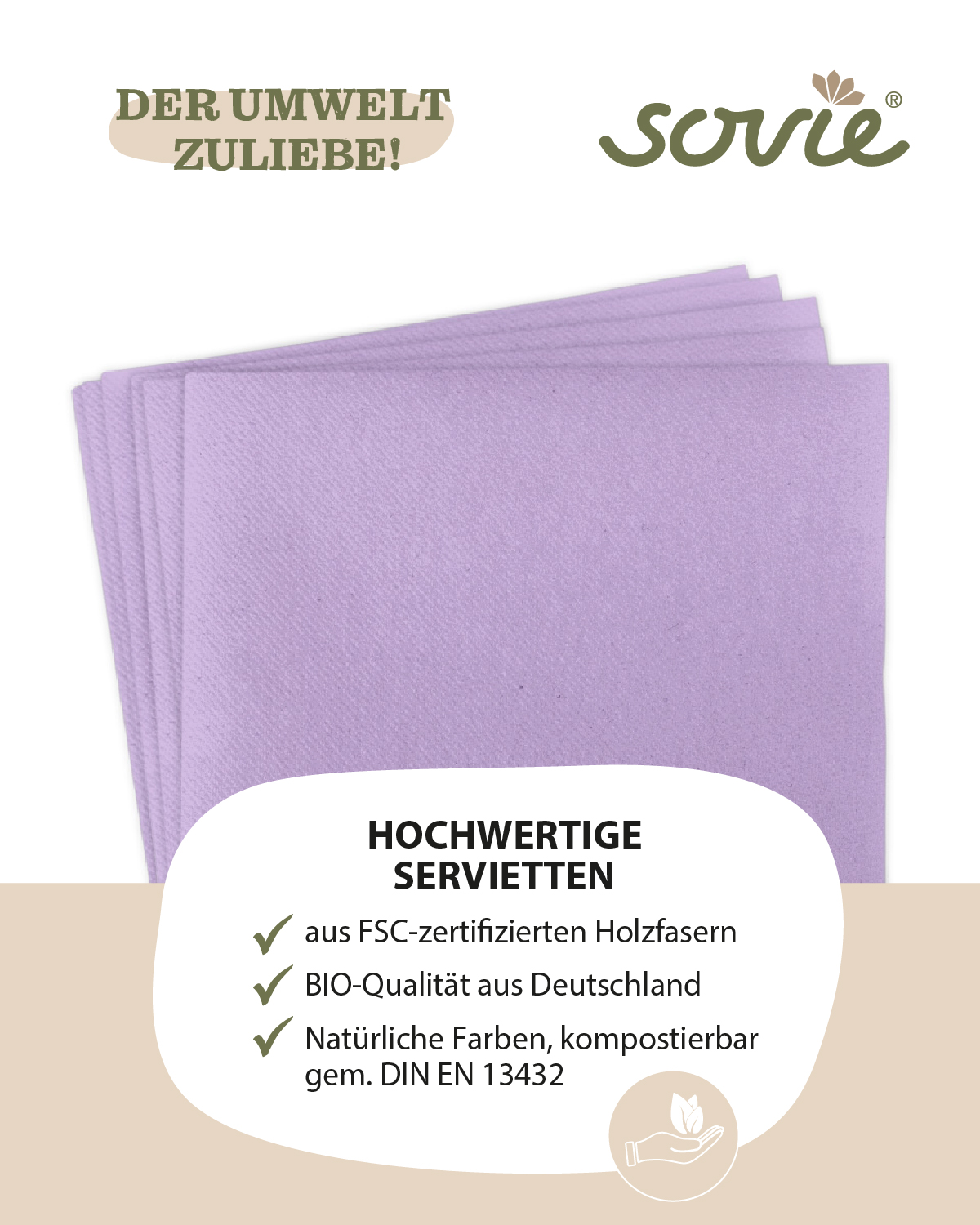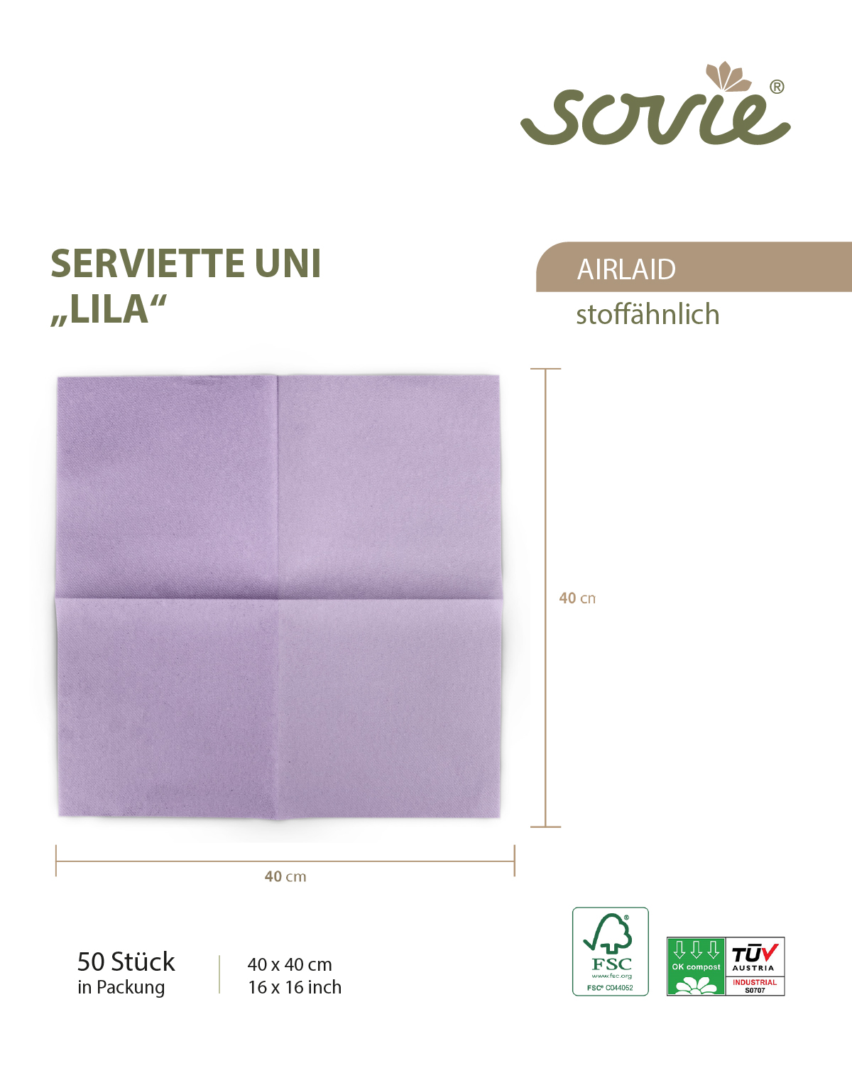 Die Serviette in LILA lässt sich mühelos mit anderen Dekorationselementen kombinieren und sorgt für einen harmonischen, eleganten Gesamteindruck. Sie ist einfach zu entfalten und verleiht jeder Veranstaltung eine luxuriöse Atmosphäre. Ob bei Hochzeiten, festlichen Dinnern oder besonderen Anlässen, diese Serviette in LILA bietet sowohl optische Raffinesse als auch praktische Funktionalität und wird Ihre Gäste beeindrucken.