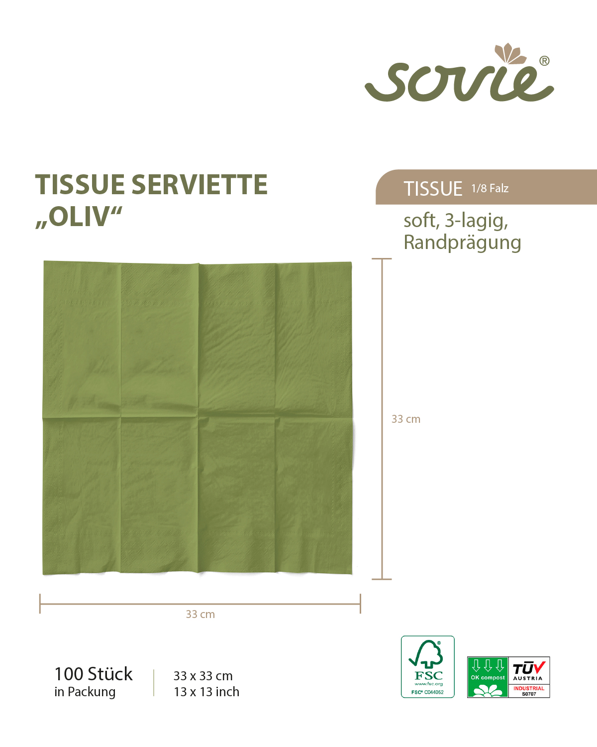 Serviette in Oliv aus Tissue 3-lagig, 1/4 Falz, 33 x 33 cm, 100 Stück