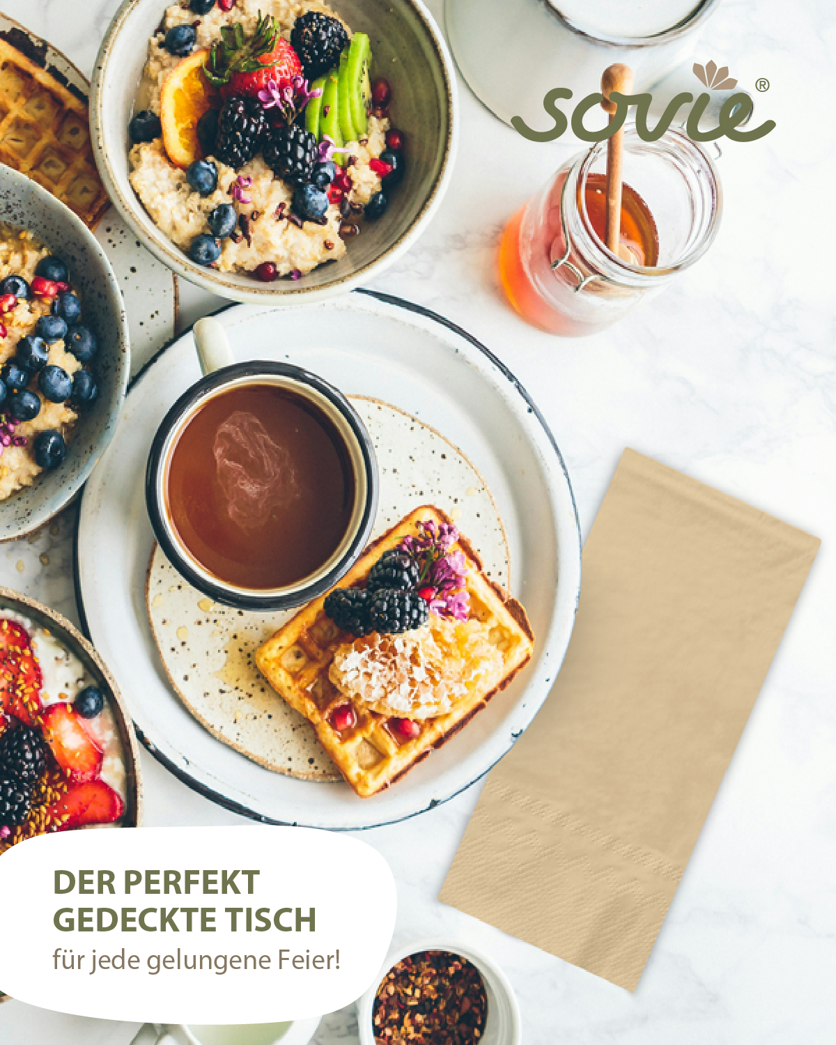 Unsere Tissue-Servietten in sanftem Sandton sind die ideale Wahl, um Ihrer Tischdekoration eine natürliche und entspannte Atmosphäre zu verleihen. Mit einer großzügigen Größe von 33 x 33 cm und einem praktischen 1/8-Falz-Design bieten sie ausreichend Platz und Funktionalität für verschiedene Anlässe.