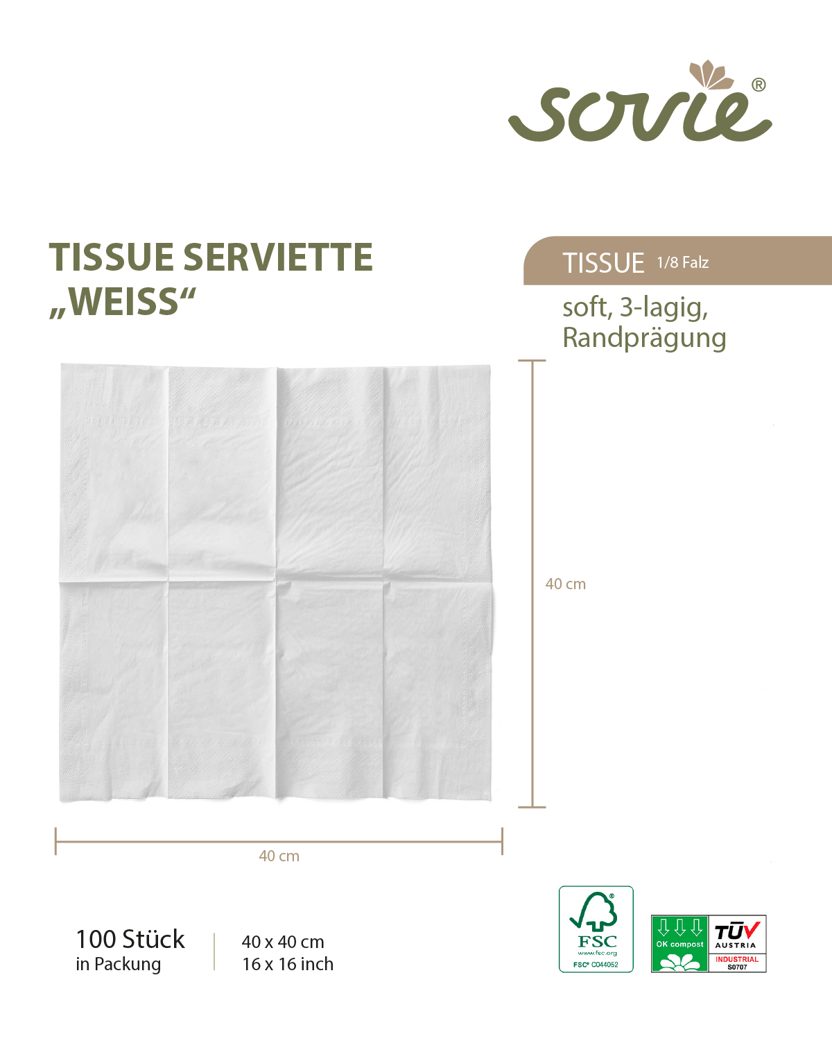 Serviette in Weiß aus Tissue 3-lagig, 1/4 Falz, 40 x 40 cm, 100 Stück