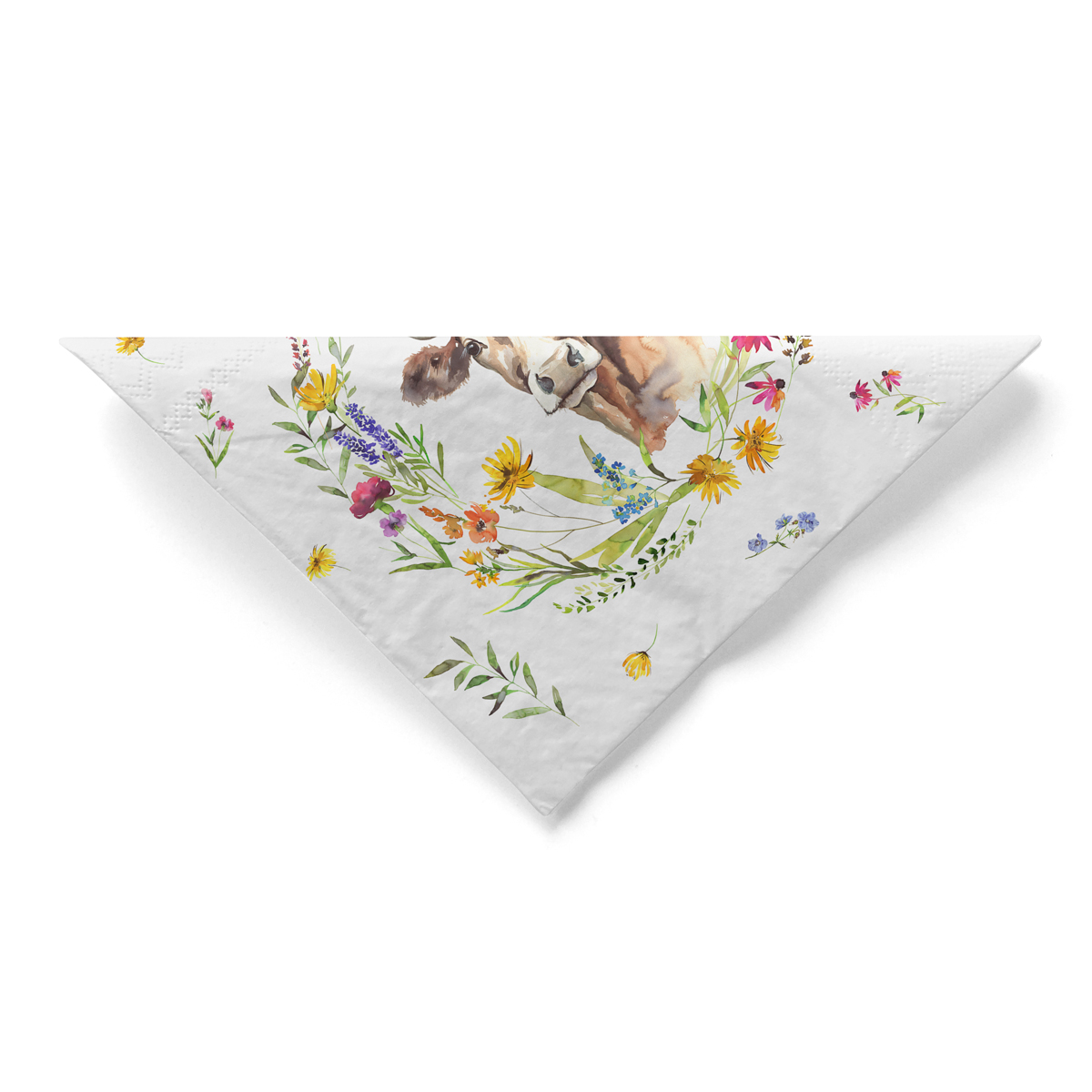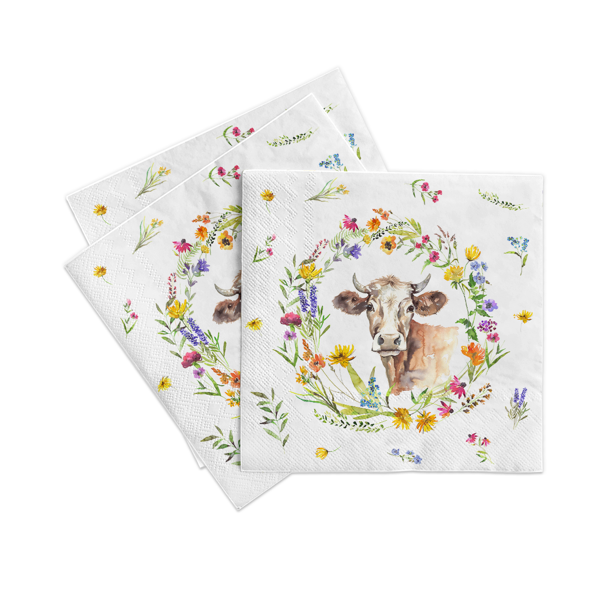 Das liebevoll gestaltete Design zeigt einen frühlingshaften Blumenkranz in den Farben Violett, Lila und Gelb auf weißem Hintergrund. Im Mittelpunkt des Kranzes befindet sich ein charmantes Kuh-Motiv, das der Tischdekoration eine besondere, verspielte Note verleiht. Diese Kombination aus floralen Elementen und Tiermotiv sorgt für eine freundliche und einzigartige Atmosphäre.