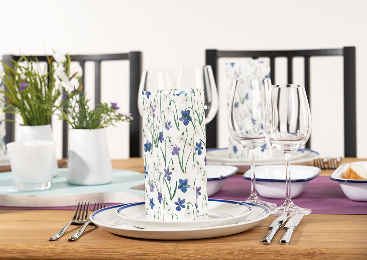 Das elegante Streublumen-Design in den Farben Amethyst-Aubergine, Royalblau und Grün auf weißem Hintergrund verleiht jeder Tischdekoration eine frische und zugleich edle Ausstrahlung. Die fein verteilten floralen Elemente schaffen eine harmonische, lebendige Atmosphäre und passen perfekt zu festlichen Anlässen wie Hochzeiten, Geburtstagen oder Gartenpartys.