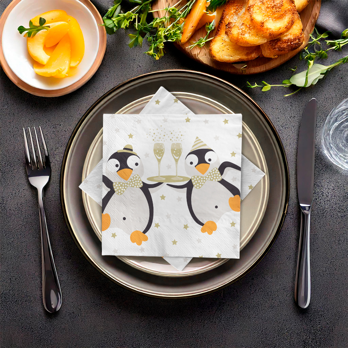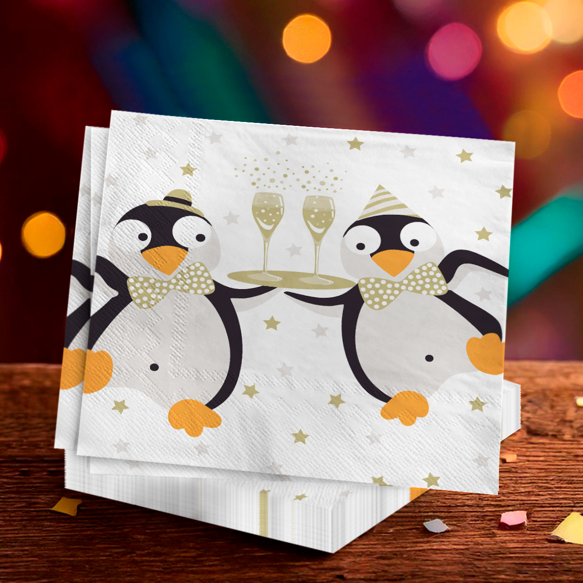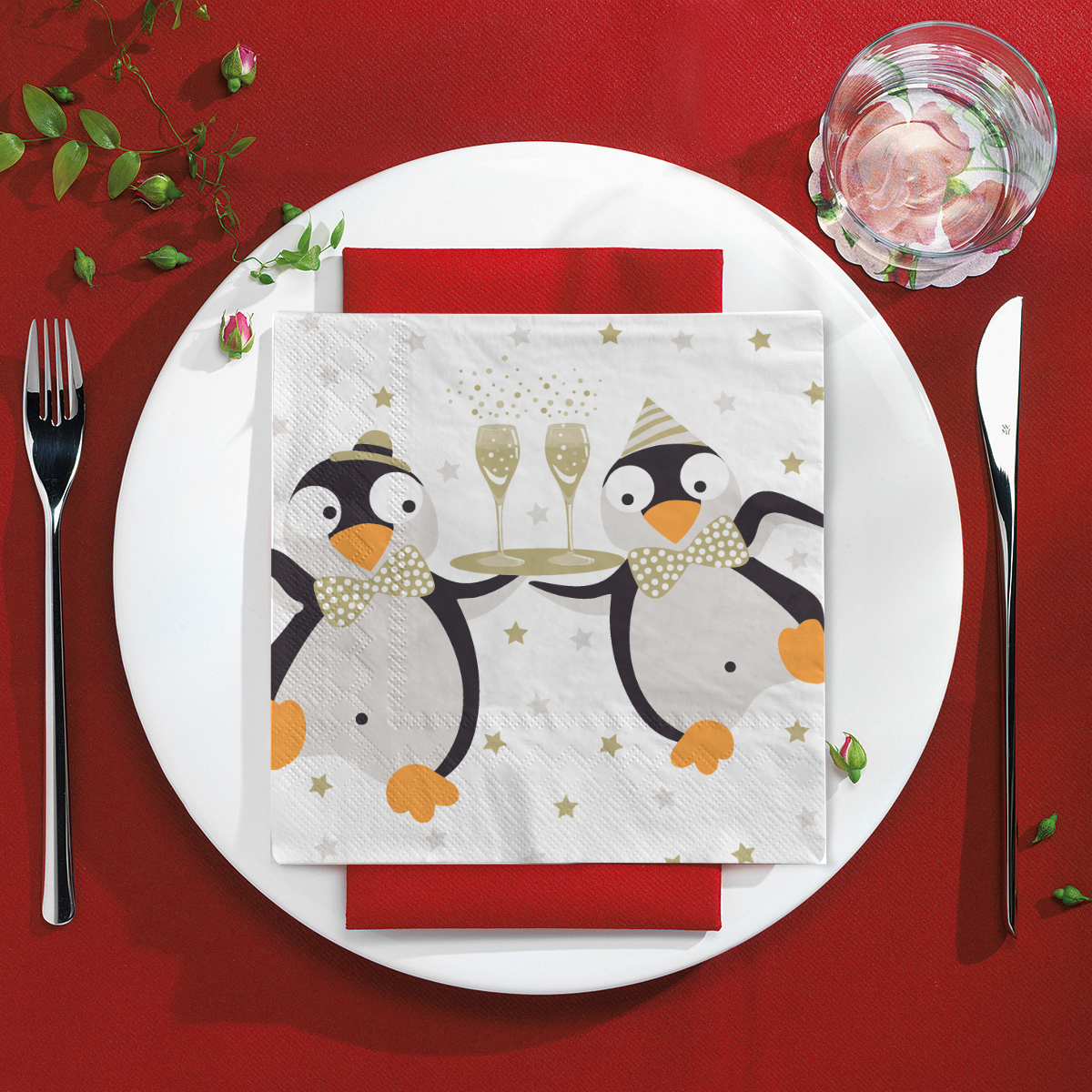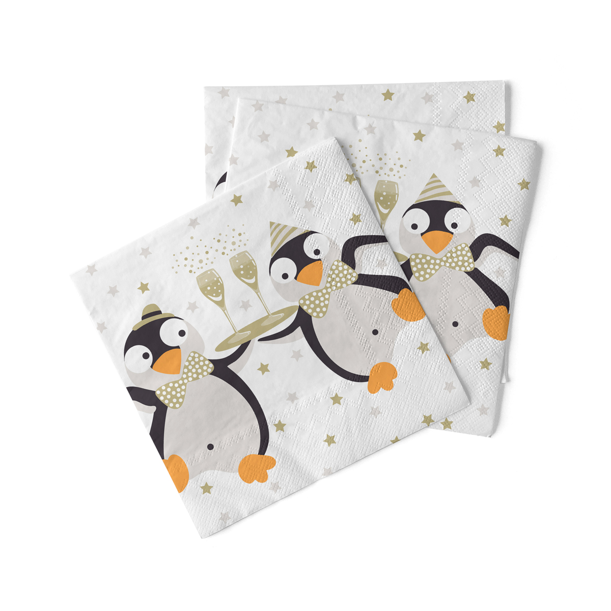 Die Servietten "PINGUIN" überzeugen mit einem charmanten Motiv: Zwei fröhliche Pinguine, die festlich Sektgläser servieren. Dieses liebevolle Design passt perfekt zur Winterzeit, zu festlichen Anlässen oder zu Silvester. Mit ihrer heiteren Ausstrahlung verleihen die Servietten Ihrer Tischdeko einen besonderen und zugleich fröhlichen Charakter.