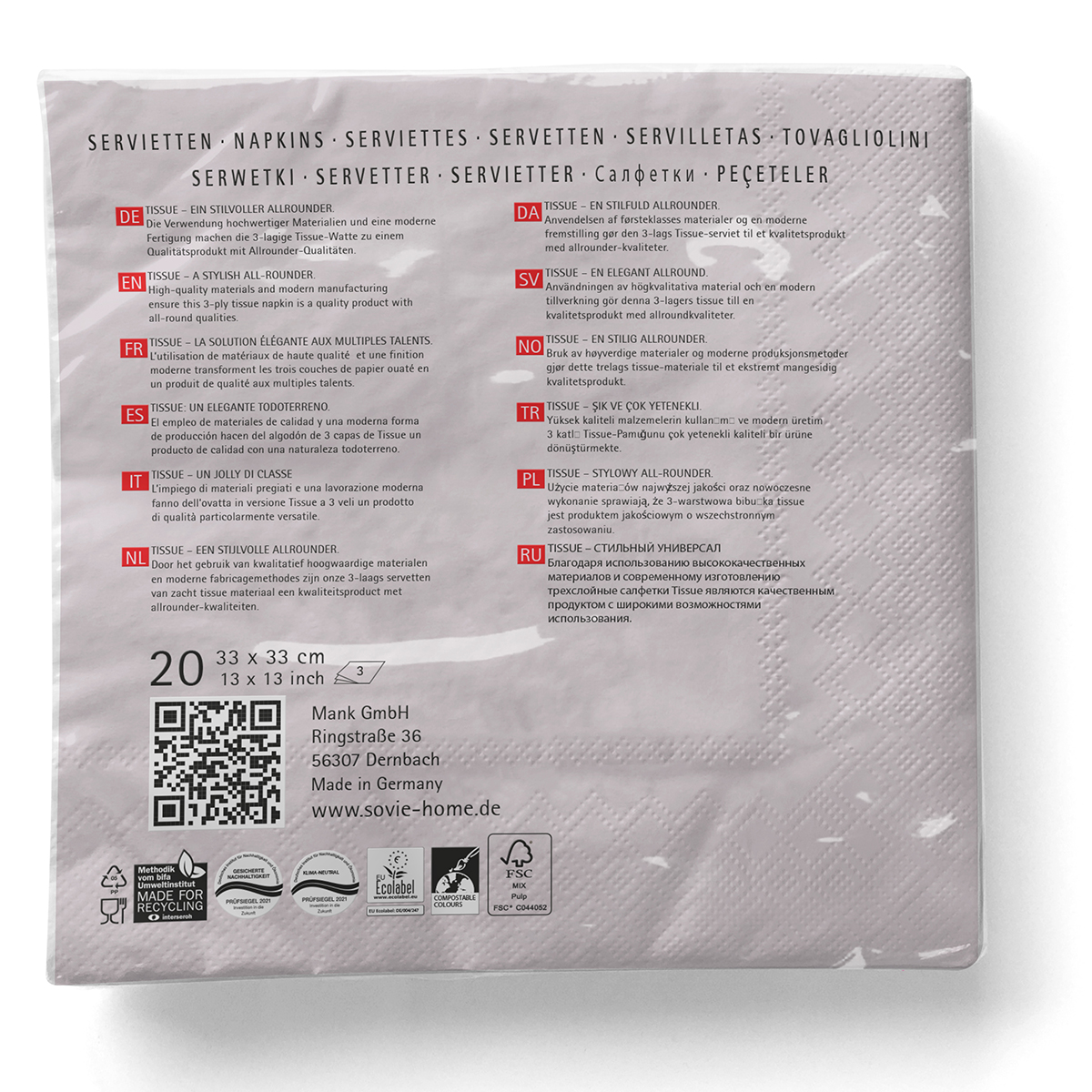 Dank des hochwertigen 3-lagigen Tissue-Materials überzeugt die Serviette nicht nur durch ihre ansprechende Optik, sondern auch durch hohe Saugfähigkeit und weiche Haptik. Mit den Maßen von 33 x 33 cm und der praktischen 1/4 Falz lässt sie sich vielseitig falten und kreativ in Ihre Tischdekoration einbauen.