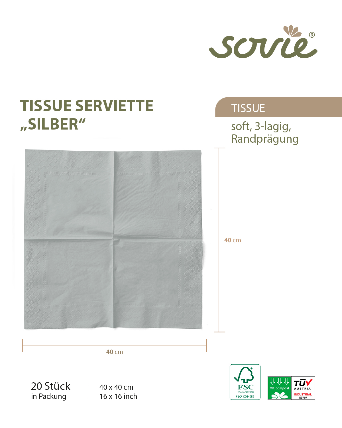 Serviette Silber aus Tissue 40 x 40 cm, 3-lagig, 20 Stück