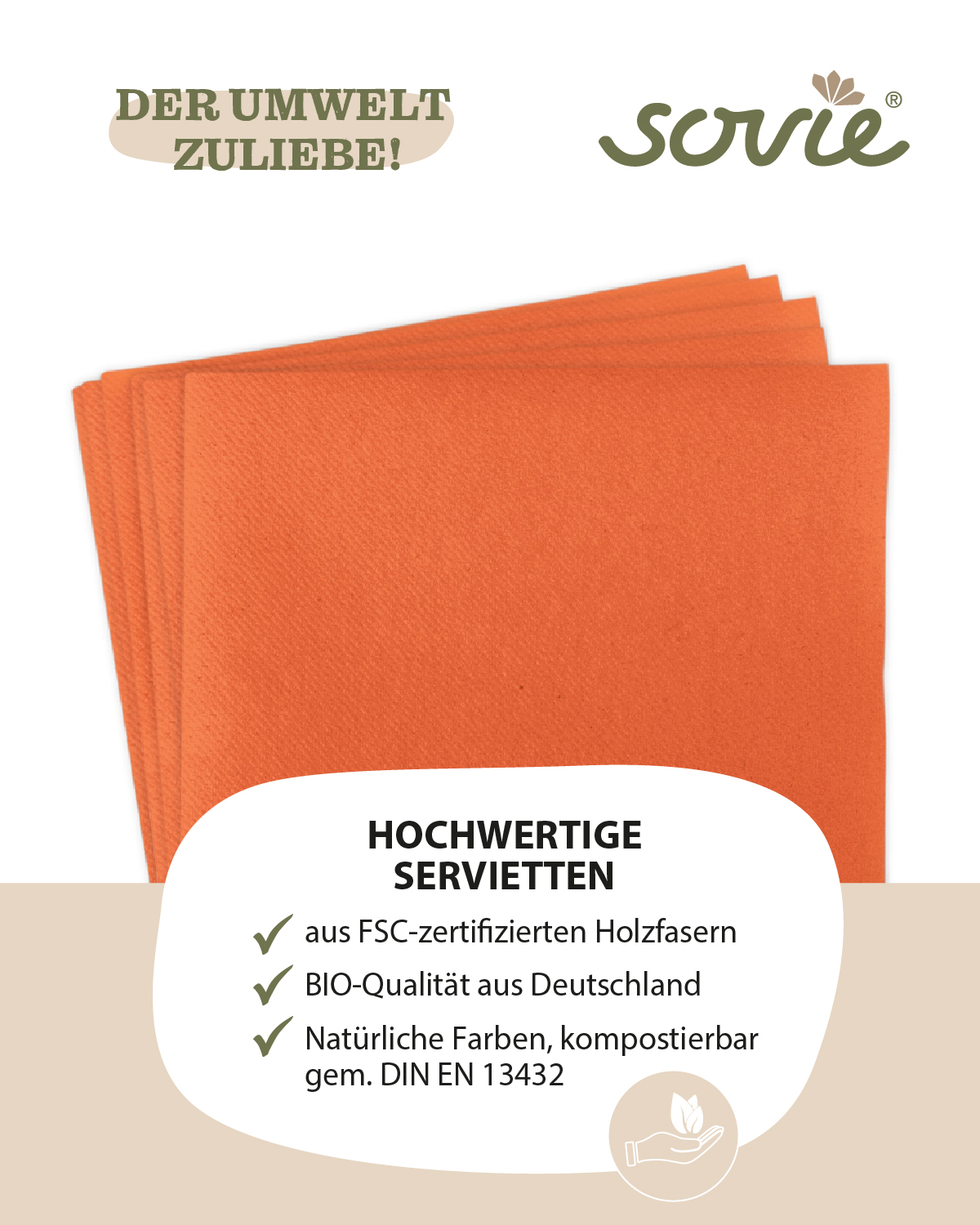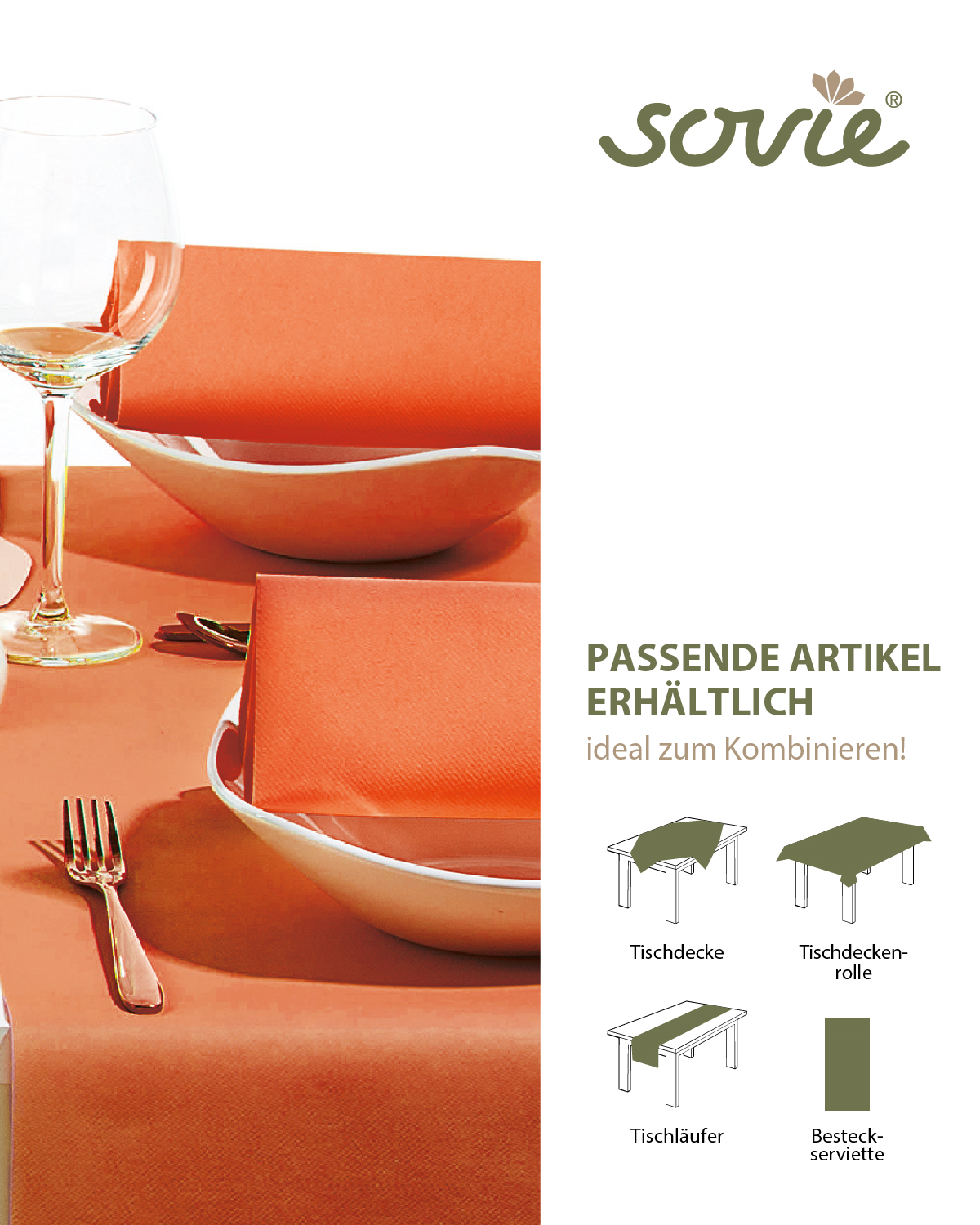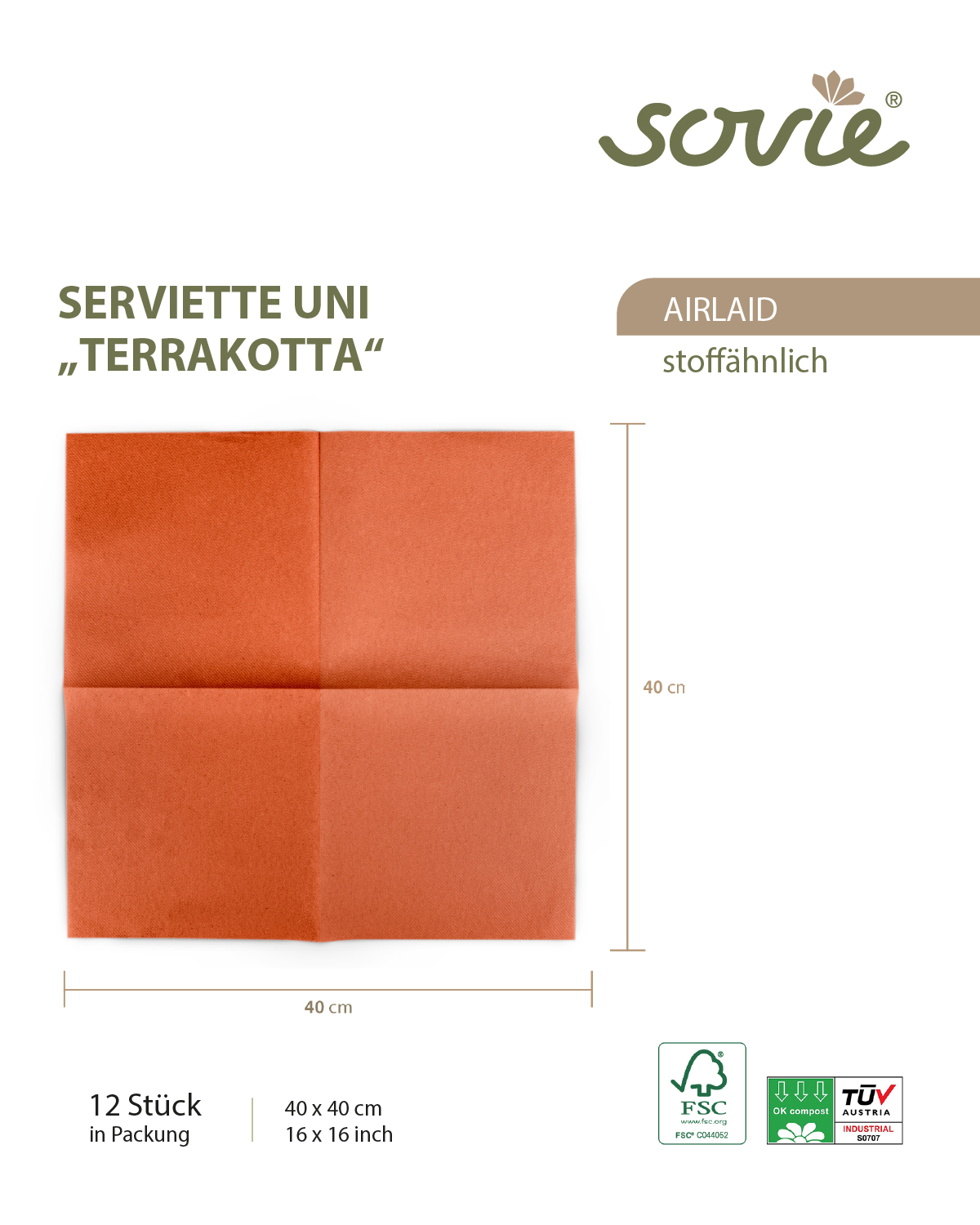 Die Packung enthält 12 Stück und ist damit eine praktische Lösung für kleinere Veranstaltungen oder als stilvolle Ergänzung für Ihre Tischdekoration zuhause. Die kräftige Farbe TERRAKOTTA in Kombination mit dem hochwertigen Linclass® Airlaid-Material sorgt für eine warme und ansprechende Tischgestaltung, die bei jedem Anlass besticht.