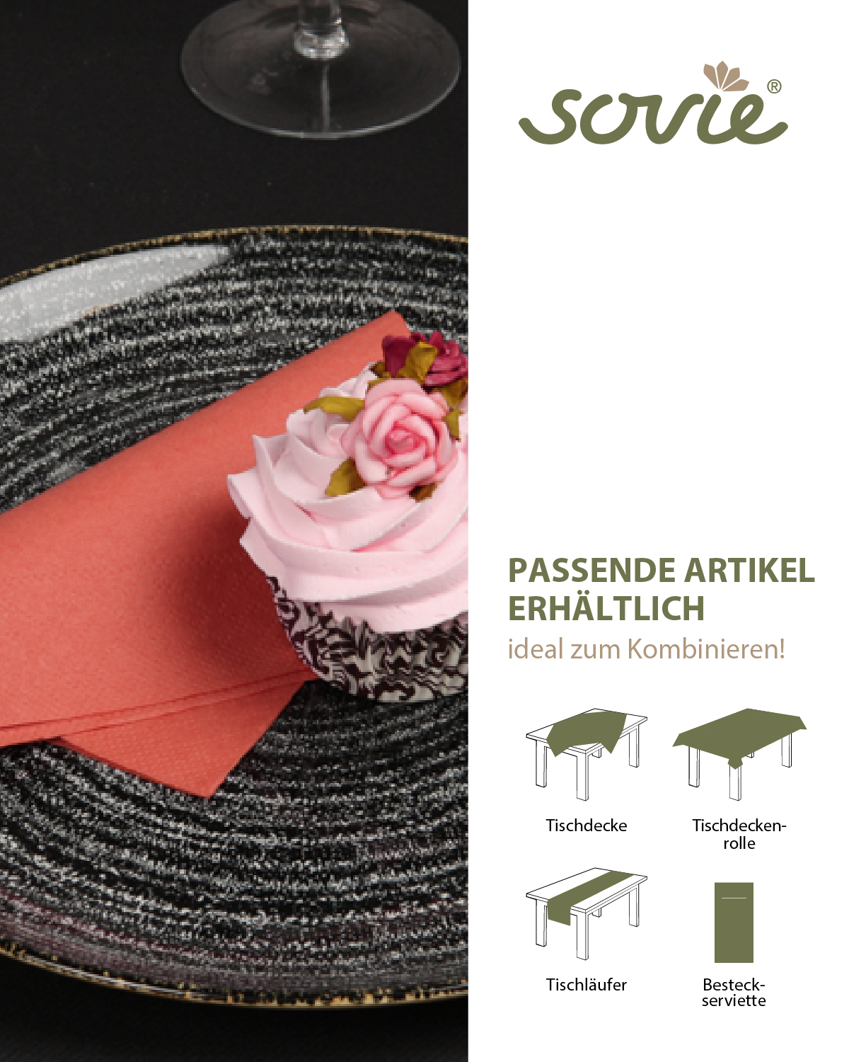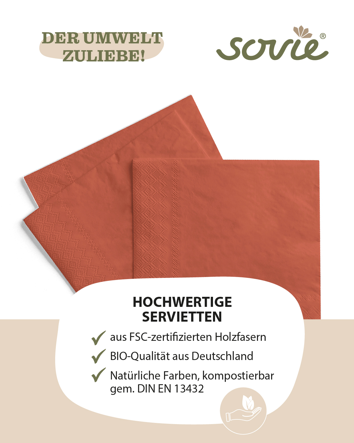 Die Serviette in TERRAKOTTA aus hochwertigem Tissue verleiht Ihrer Tischdekoration eine warme und erdige Note. Mit ihrer kräftigen, rustikalen Farbe eignet sie sich hervorragend für herbstliche Anlässe, Hochzeiten, Dinnerpartys oder andere festliche Feiern. Die großzügige Größe von 40 x 40 cm bietet genug Fläche für kreative Falttechniken und garantiert eine beeindruckende Präsentation.